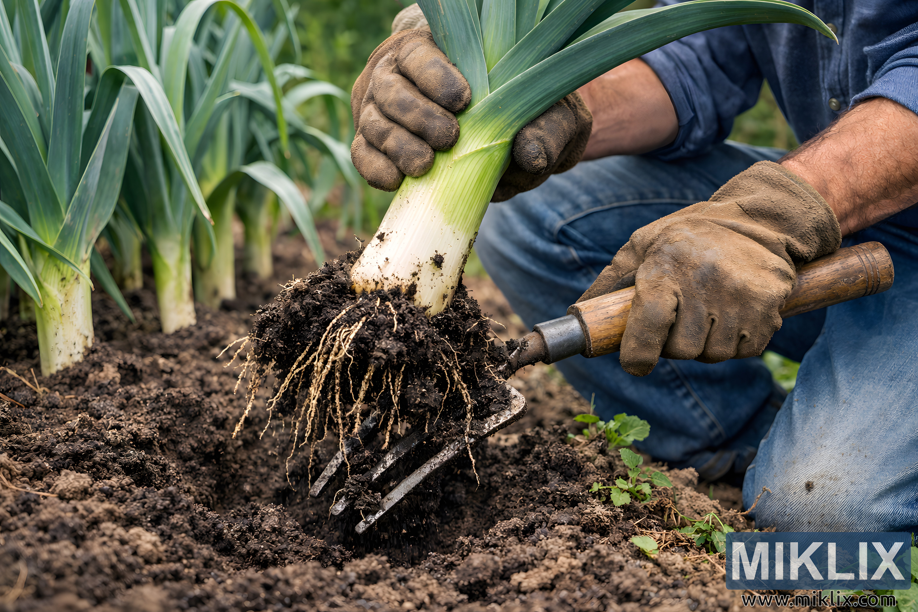 Foto ravvicinata di una corretta raccolta di porri, che mostra un giardiniere che usa una forca per smuovere il terreno e sollevare delicatamente un porro maturo con le radici intatte.