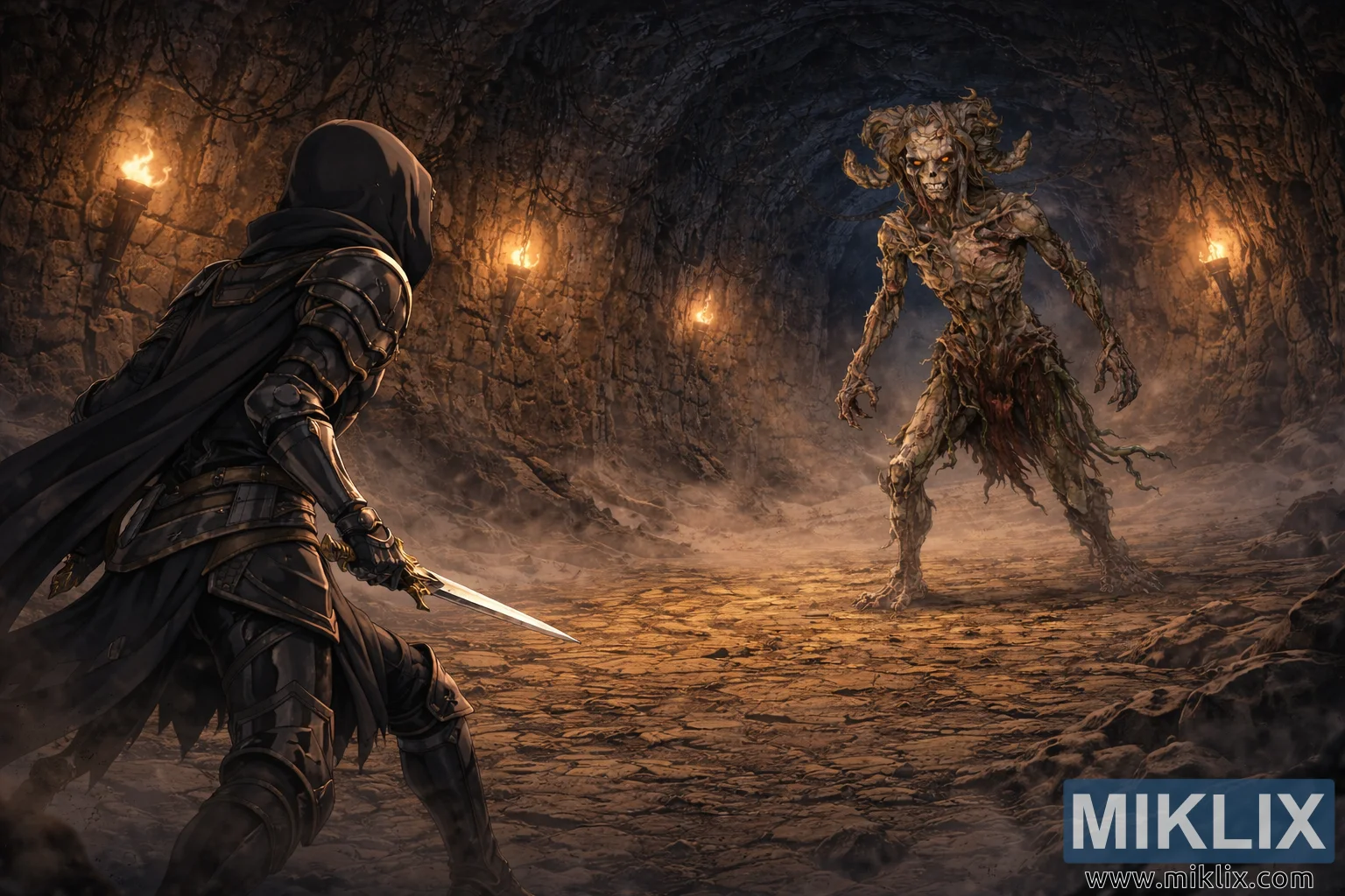 Lo sfondo ingrandito rivela l'architettura opprimente della prigione: muri di pietra grezza si inarcano in una camera simile a un tunnel, con numerose torce montate lungo entrambi i lati. Le loro fiamme proiettano calde e tremolanti pozze di luce che si increspano sulla muratura, sull'armatura e sulla forma contorta della creatura. In alto, pesanti catene si avvolgono e drappeggiano in linee aggrovigliate, stagliandosi contro la roccia più scura e aggiungendo un senso di peso e prigionia. L'estremità del corridoio si ritira in ombre più fredde, dove la foschia grigio-bluastra e l'oscurità inghiottono i dettagli, aumentando la profondità e il terrore.