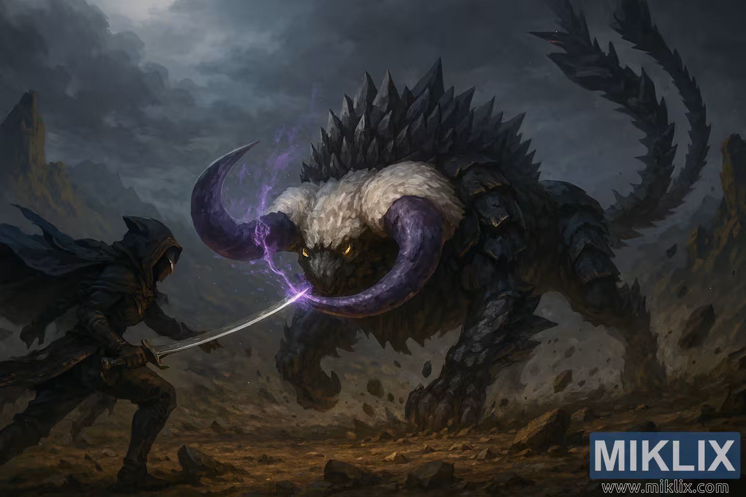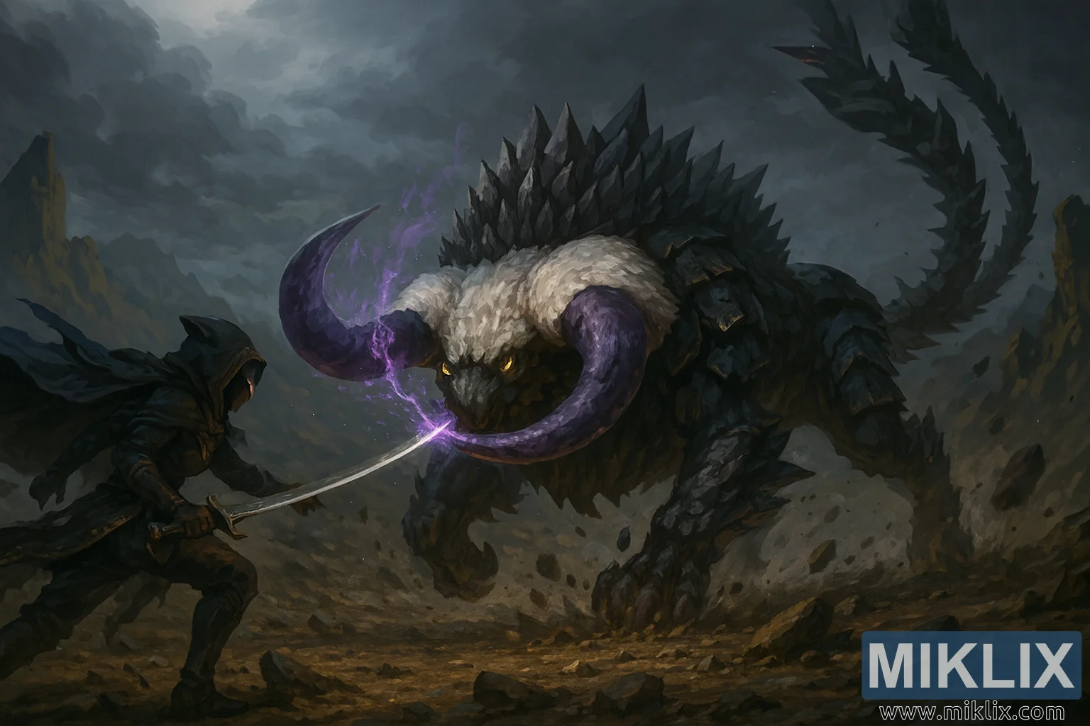 L'ambiente circostante rafforza la portata epica dell'incontro. Il fondo del cratere è arido e irregolare, disseminato di rocce frantumate e detriti. Sullo sfondo, pareti rocciose frastagliate si stagliano in lontananza, parzialmente oscurate da vortici di polvere e nebbia. In alto, un cielo carico di tempesta è tempestato di pesanti nuvole scure, che lasciano filtrare solo una luce soffusa e diffusa. Questa illuminazione crea forti contrasti, mettendo in risalto le figure e lasciando gran parte del paesaggio avvolto nell'ombra.