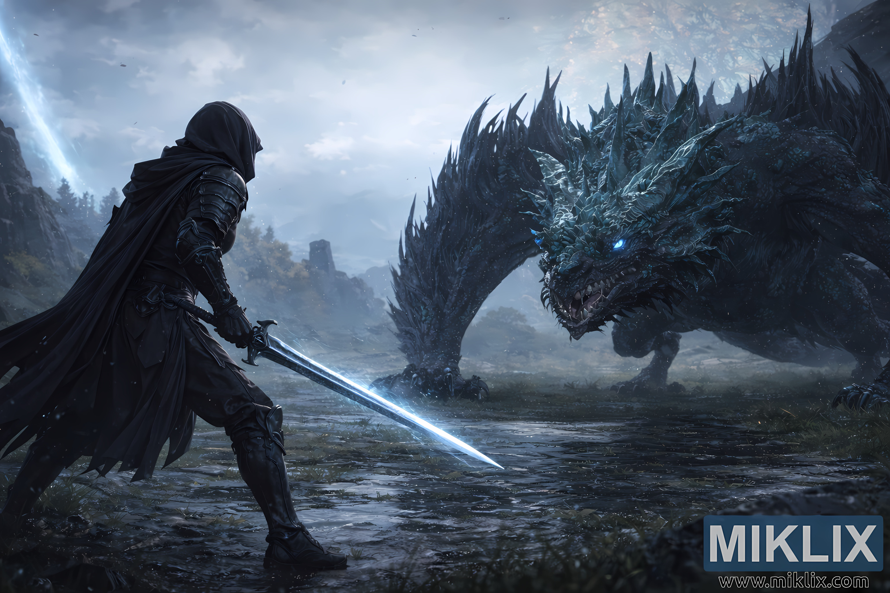 L'ambiente circostante accresce la tensione. Il terreno è fradicio e irregolare, punteggiato di pozzanghere, erba bagnata e fango che rispecchiano i toni tenui del blu e del grigio del cielo coperto. La nebbia aleggia sulla scena, attenuando i contorni delle rovine lontane e degli alberi radi sullo sfondo. Sottili goccioline aleggiano nell'aria, suggerendo una pioggia recente e conferendo al paesaggio un tono freddo e cupo.