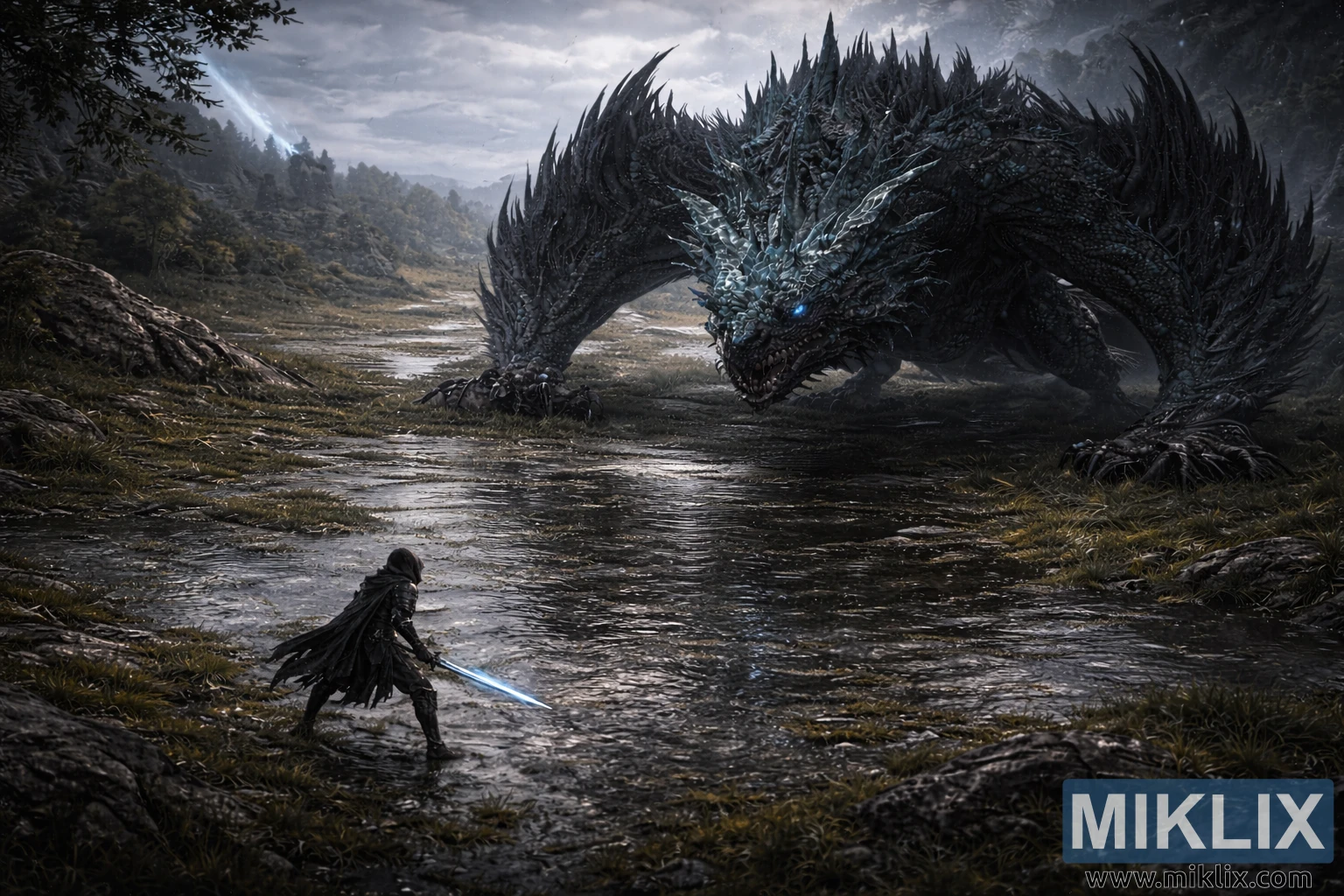 L'ambiente circostante acquisisce importanza dalla visuale isometrica. Pozze poco profonde, canali fangosi, erba bagnata e rocce sparse formano un campo di battaglia complesso e irregolare. Increspature si diffondono dagli artigli del drago, dove premono sul terreno saturo. In lontananza, rovine di pietra spezzata, alberi radi e terreno ondulato sfumano in strati di nebbia, mentre il cielo coperto proietta una luce piatta e fredda sull'intera scena.