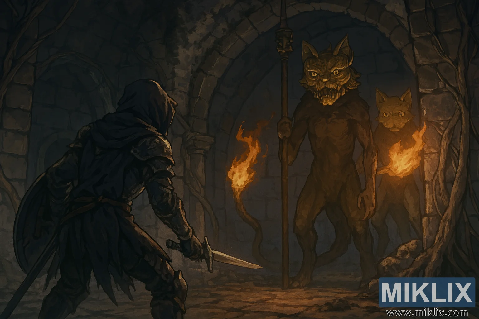 Fan art ispirata agli anime che raffigura l'armatura Tarnished in Black Knife mentre affronta il duo Erdtree Burial Watchdog nelle catacombe di Minor Erdtree, pochi istanti prima della battaglia.