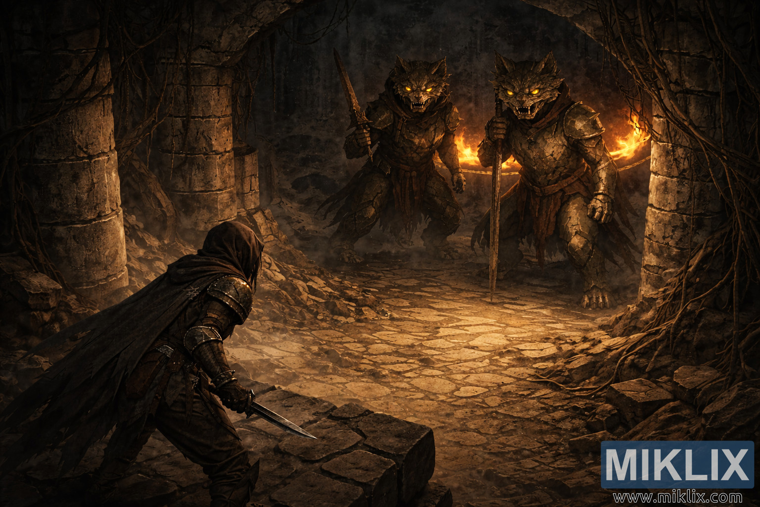 L'angolazione isometrica enfatizza lo squilibrio di potere: il Tarnished è visivamente rimpicciolito e isolato nell'angolo, mentre i due guardiani dominano il lato opposto dell'arena. Nessun movimento ha ancora rotto l'immobilità, ma la geometria della composizione, le linee convergenti del pavimento e gli sguardi incrociati suggeriscono l'inevitabilità del conflitto. È un momento sospeso, come se il tempo stesso si fosse fermato un attimo prima che le catacombe esplodessero nella violenza.