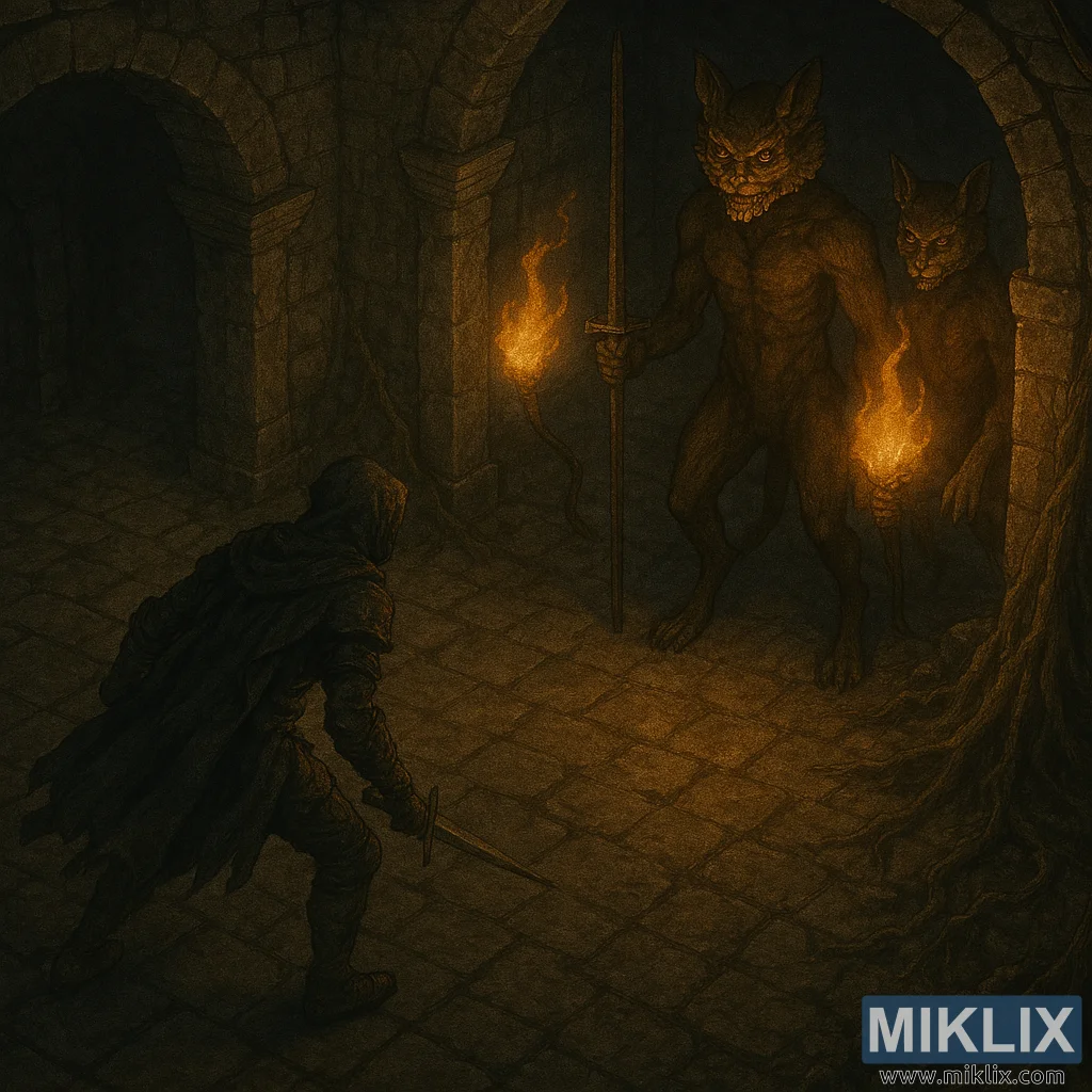 L'Appannato si trova nel quadrante inferiore sinistro dell'immagine, con le spalle rivolte all'osservatore. Indossa l'armatura del Coltello Nero: scura, consumata dal tempo e ricoperta di strati di stoffa e piastre di metallo. Un cappuccio gli nasconde il volto e il mantello gli cade pesantemente dietro, con i bordi sfilacciati che riflettono la luce della torcia. La sua postura è bassa e decisa, con il piede destro ben piantato a terra e il sinistro che avanza. Nella mano destra impugna una sottile spada a doppio taglio inclinata verso il basso, mentre il braccio sinistro pende leggermente dietro di lui per mantenere l'equilibrio. La sua postura trasmette prontezza e cautela, mentre affronta il mostruoso duo che lo precede.