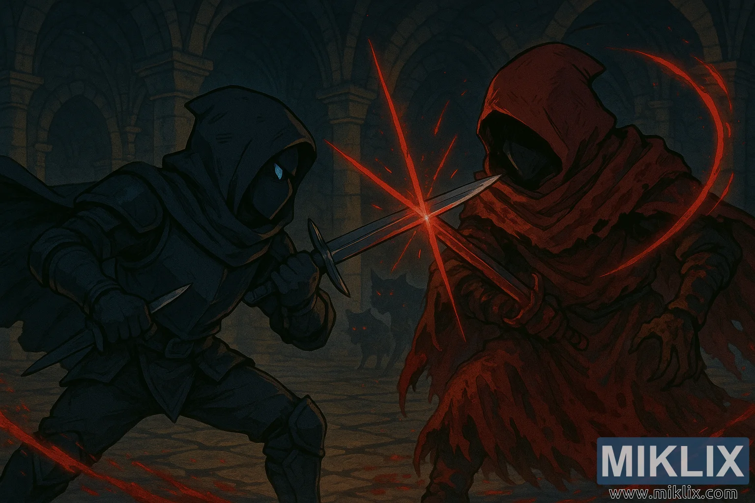 Il cozzo delle loro lame costituisce il centro visivo: una piccola esplosione di scintille rosse, a forma di stella e violenta, che proietta una luce di breve durata sulla pietra circostante. Un ampio arco di energia rossa si snoda dietro Esgar, dipinto come una cometa di sangue attraverso l'inquadratura. Gli effetti irradiano movimento: una fetta che si allarga, un'onda d'urto silenziosa. Sotto i loro piedi, l'antico pavimento della catacomba è segnato dal tempo: ciottoli irregolari punteggiati di crepe, polvere e macchie sottili. Colonne e archi svettano dietro di loro, inghiottiti dall'oscurità, eppure la debole luce delle torce brilla come braci morenti in lontananza, rivelando momentanee sacche di calore giallo inghiottite dal freddo circostante.