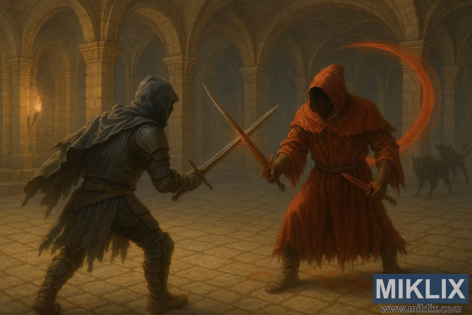 Realistica fan art di Elden Ring che raffigura i Tarnished che si scontrano con le lame di un Sacerdote del Sangue incappucciato nelle sale di pietra illuminate dalle torce delle Catacombe di Leyndell.