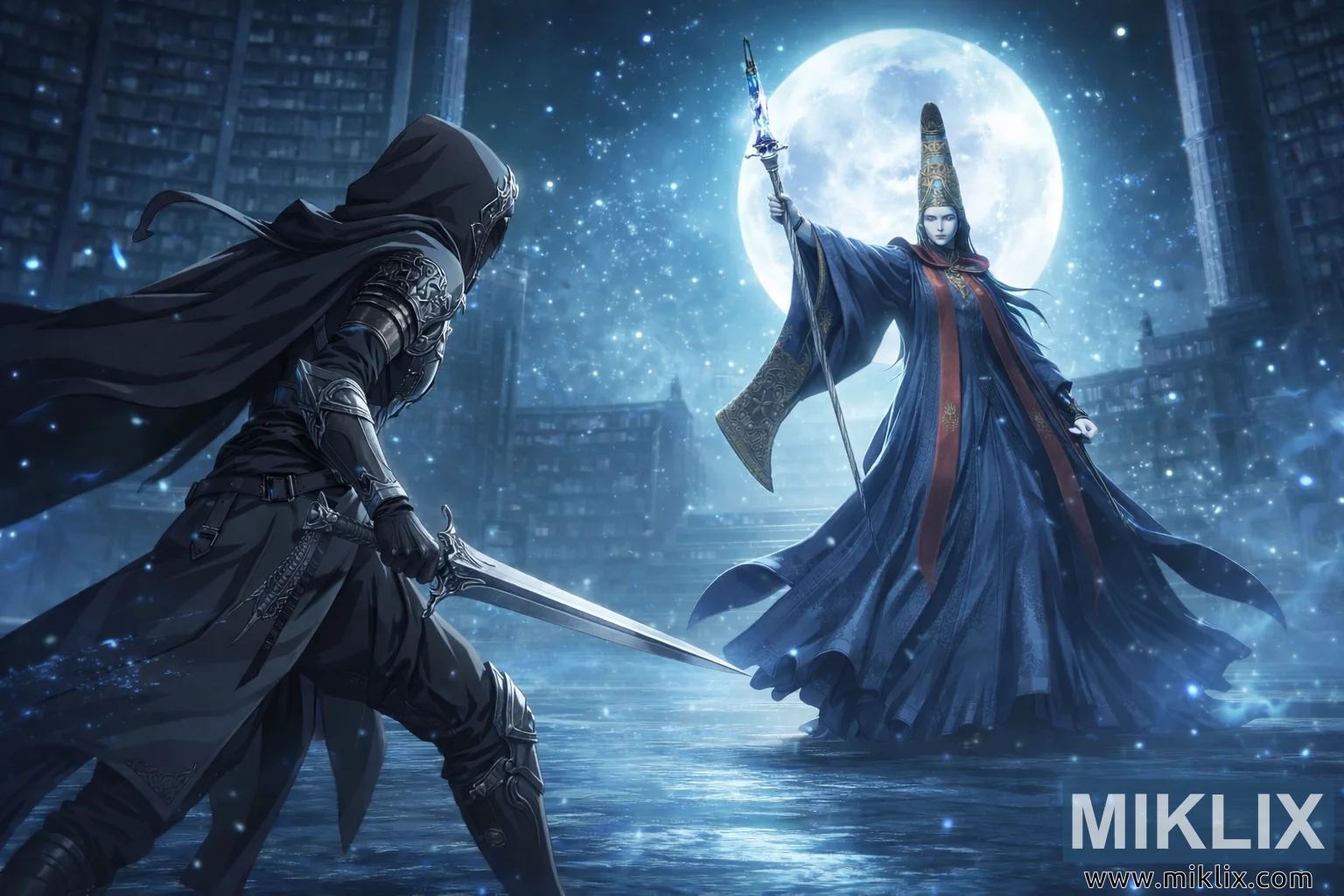 Lo sfondo è dominato da imponenti librerie curve che sfumano nell'ombra man mano che si elevano verso l'alto, rafforzando il senso di un antico e sacro luogo di conoscenza. La luna piena illumina la parte superiore centrale della scena, proiettando una luce radiosa che inonda la sala e illumina innumerevoli particelle scintillanti che fluttuano nell'aria come polvere di stelle. Queste particelle, insieme alle deboli increspature dell'acqua sottostante, aggiungono movimento e profondità a un momento altrimenti immobile. La superficie riflettente dell'acqua riflette sia le figure che la luna in alto, leggermente distorta da delicate increspature che preannunciano l'imminente scontro.