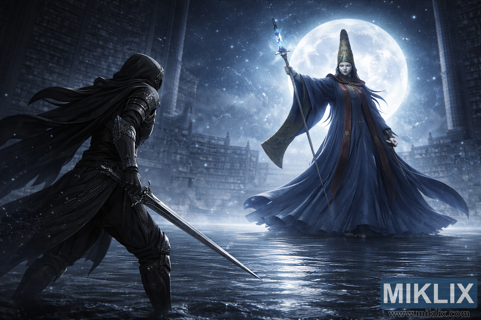 Dominare il lato destro della scena è Rennala, raffigurata in scala più grande per enfatizzare il suo potere travolgente. Si libra sopra la superficie dell'acqua, con una presenza monumentale e imponente. Le vesti di Rennala sono realizzate con tessuti a strati in blu intenso e cremisi tenue, ornati da intricati ricami dorati che sembrano invecchiati e cerimoniali piuttosto che ornamentali. Le pieghe delle sue vesti si gonfiano verso l'esterno con un senso di peso e movimento reali. Il suo alto copricapo conico si erge alto, incorniciato direttamente dall'imponente luna piena alle sue spalle. Solleva il suo bastone sopra la testa, la cui punta cristallina brilla di un'energia arcana, pallida e contenuta. Il volto di Rennala è calmo e distante, la sua espressione solenne e malinconica, a trasmettere un immenso potere mantenuto in un silenzioso controllo piuttosto che in un'aggressività palese.