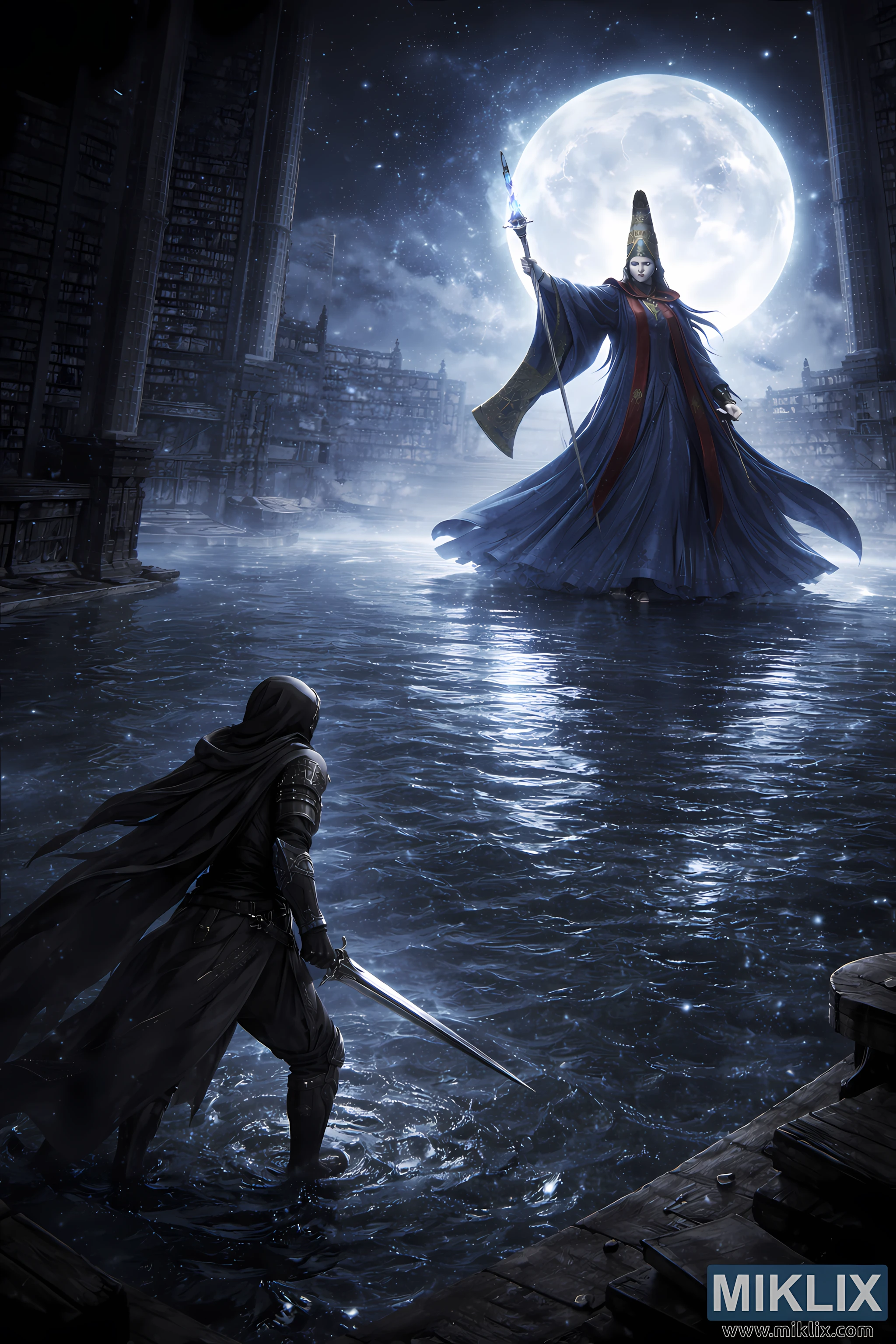 Al centro-destra della scena, Rennala domina la composizione sia visivamente che simbolicamente. Si libra sull'acqua, apparendo significativamente più grande grazie alla prospettiva e all'inquadratura. Le sue vesti fluenti si estendono verso l'esterno in ampie pieghe stratificate, rese con un peso realistico del tessuto e intricati ricami dorati che danno un senso cerimoniale e antico. L'alto copricapo conico si erge drammaticamente, stagliandosi contro l'enorme luna piena alle sue spalle. Rennala solleva il suo bastone, la cui punta cristallina emette un tenue bagliore arcano blu pallido. La sua espressione è calma, distante e malinconica, e trasmette un potere travolgente mantenuto in un silenzioso controllo piuttosto che in un'aggressività.