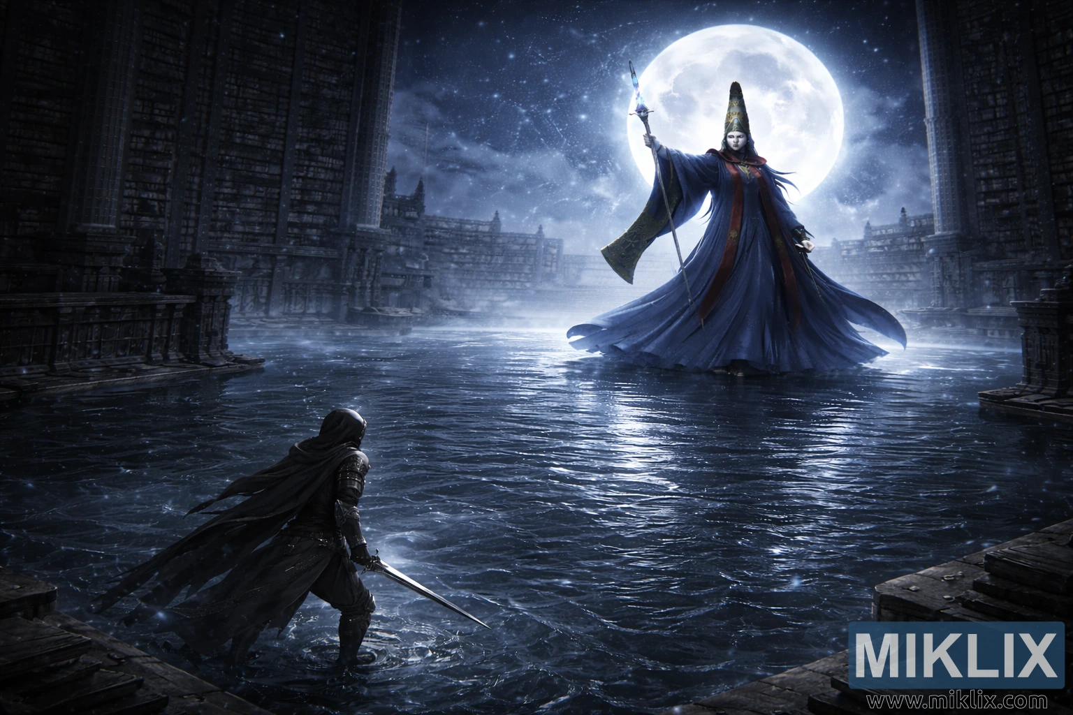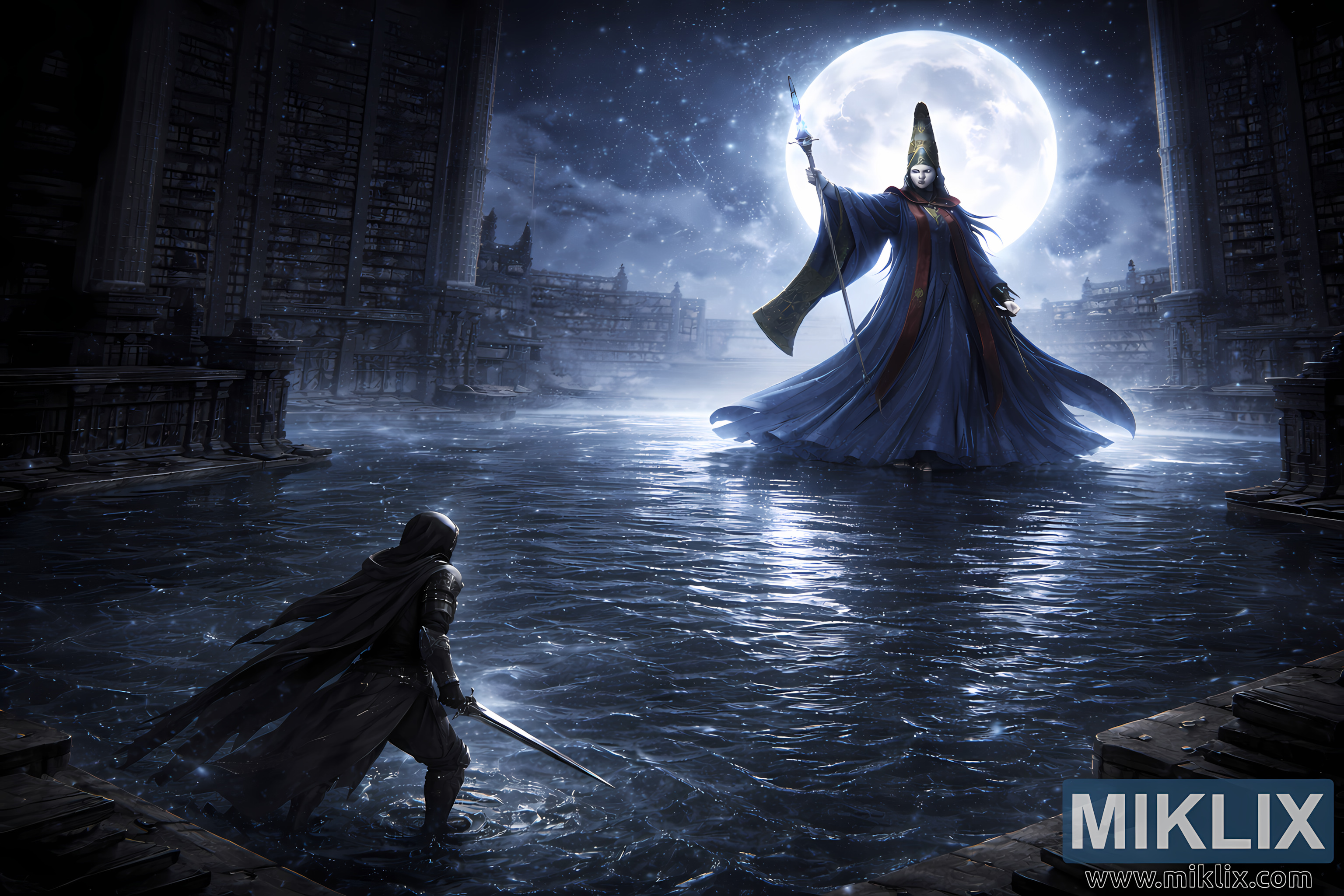 Leggermente centrata sulla destra, domina la scena Rennala, raffigurata in scala più grande per trasmettere il suo immenso potere. Si libra sopra la superficie dell'acqua, con una presenza serena ma travolgente. Le vesti fluenti di Rennala sono realizzate con tessuti a strati realistici, in blu intenso e cremisi tenue, orlati da intricati ricami dorati che sembrano cerimoniali e antichi. Le vesti si estendono verso l'esterno in ampi archi, conferendole una silhouette quasi architettonica. Il suo alto copricapo conico si erge in modo prominente, incorniciato direttamente da una luna piena enorme e luminosa che riempie la parte superiore centrale della composizione. Rennala solleva il suo bastone, la cui punta cristallina brilla di una pallida energia arcana contenuta. La sua espressione è calma e distante, venata di malinconia, a suggerire un potere mantenuto in un silenzioso controllo piuttosto che nella rabbia.