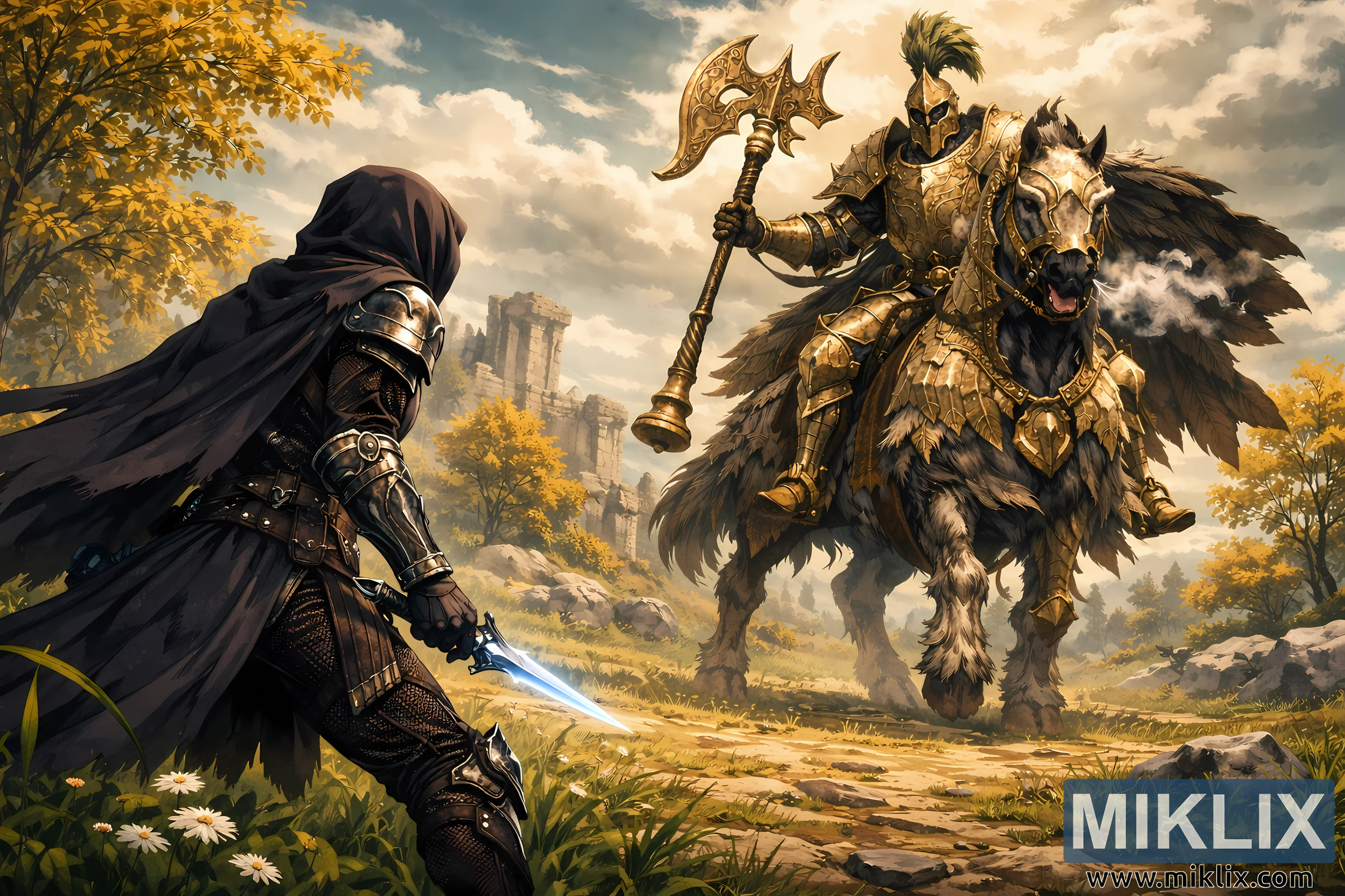 Un'ampia illustrazione fantasy ispirata agli anime presenta un teso confronto pre-battaglia in un ampio paesaggio soleggiato, ricco di fogliame dorato e antiche rovine. Il punto di vista è posizionato dietro e leggermente a sinistra del Tarnished, creando una prospettiva in terza persona che attira lo spettatore nella scena, come se si trovasse appena sopra la spalla del guerriero. Il Tarnished occupa il primo piano a sinistra, parzialmente di spalle allo spettatore, rivestito di un'elegante armatura nera composta da piastre a strati, cinghie di cuoio e tessuto finemente strutturato. Un mantello scuro con cappuccio drappeggia sulle spalle e fluisce all'indietro con un sottile senso di movimento, i cui bordi catturano tenui riflessi dalla luce del sole. L'armatura appare sia lucida che usurata, suggerendo lunghi viaggi e numerose battaglie. Nella mano destra del Tarnished c'è un corto pugnale che brilla di una debole luce bluastra, inclinato verso il basso ma chiaramente pronto per un'azione rapida. La posizione è bassa e cauta, con le ginocchia leggermente piegate, a trasmettere vigilanza e anticipazione piuttosto che aggressività immediata.