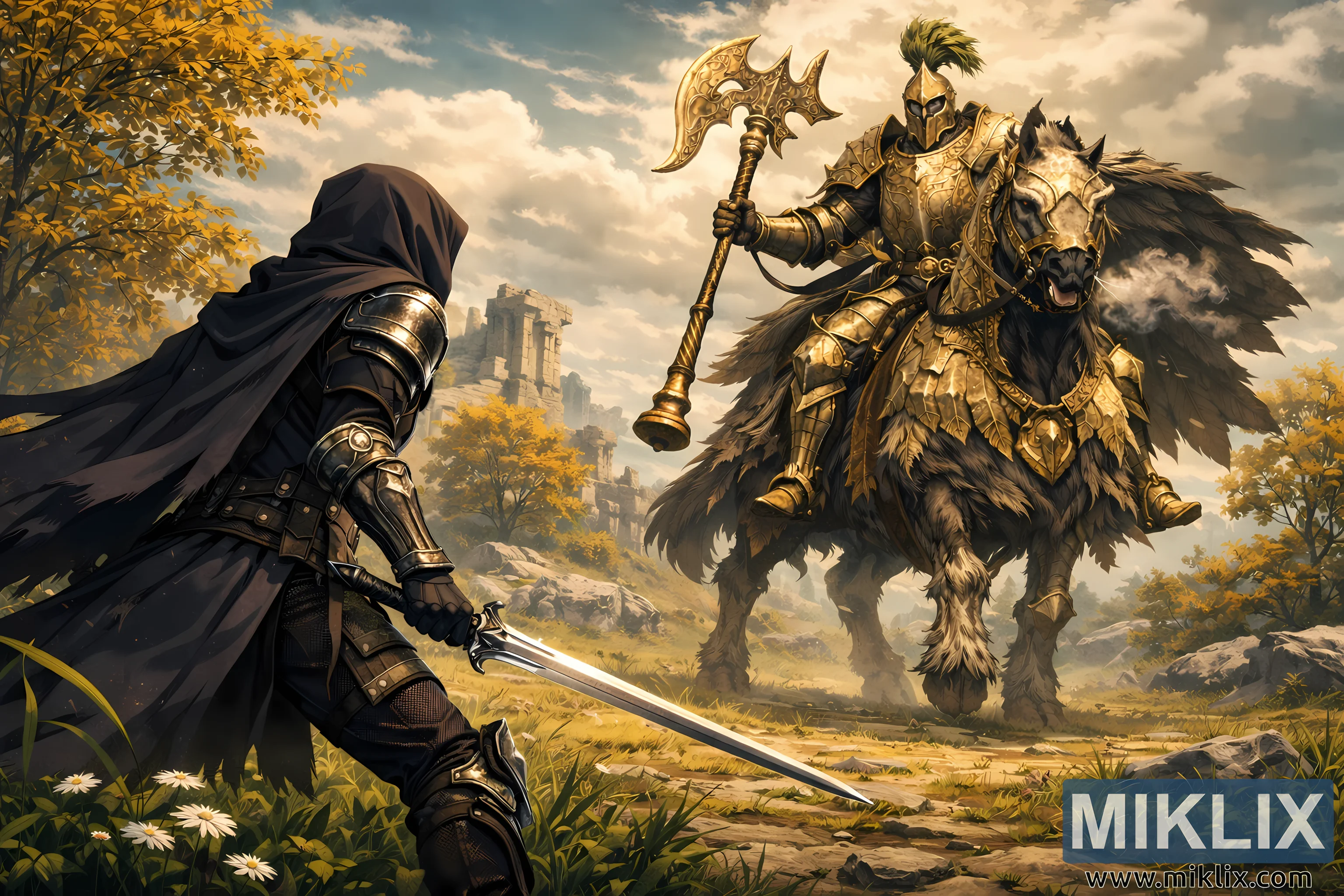 L'ambiente circostante accresce la tensione drammatica. Ondulati campi verdi si estendono in lontananza, disseminati di macchie di erba alta, piccoli fiori bianchi e sentieri di pietra irregolari. In secondo piano si ergono rovine fatiscenti – archi spezzati, pilastri spezzati e muri di pietra parzialmente crollati – che alludono ai resti di un impero dimenticato e conferiscono alla scena un senso di malinconica grandiosità. Alberi autunnali con fogliame dorato e ambrato incorniciano l'orizzonte, i cui toni caldi si armonizzano con la scintillante armatura del cavaliere a cavallo. In alto, un vasto cielo colmo di soffici nuvole e tenui sfumature azzurre permette ai raggi di sole di filtrare diagonalmente attraverso la scena, proiettando dinamici giochi di luce e ombra sia sui personaggi che sul terreno.