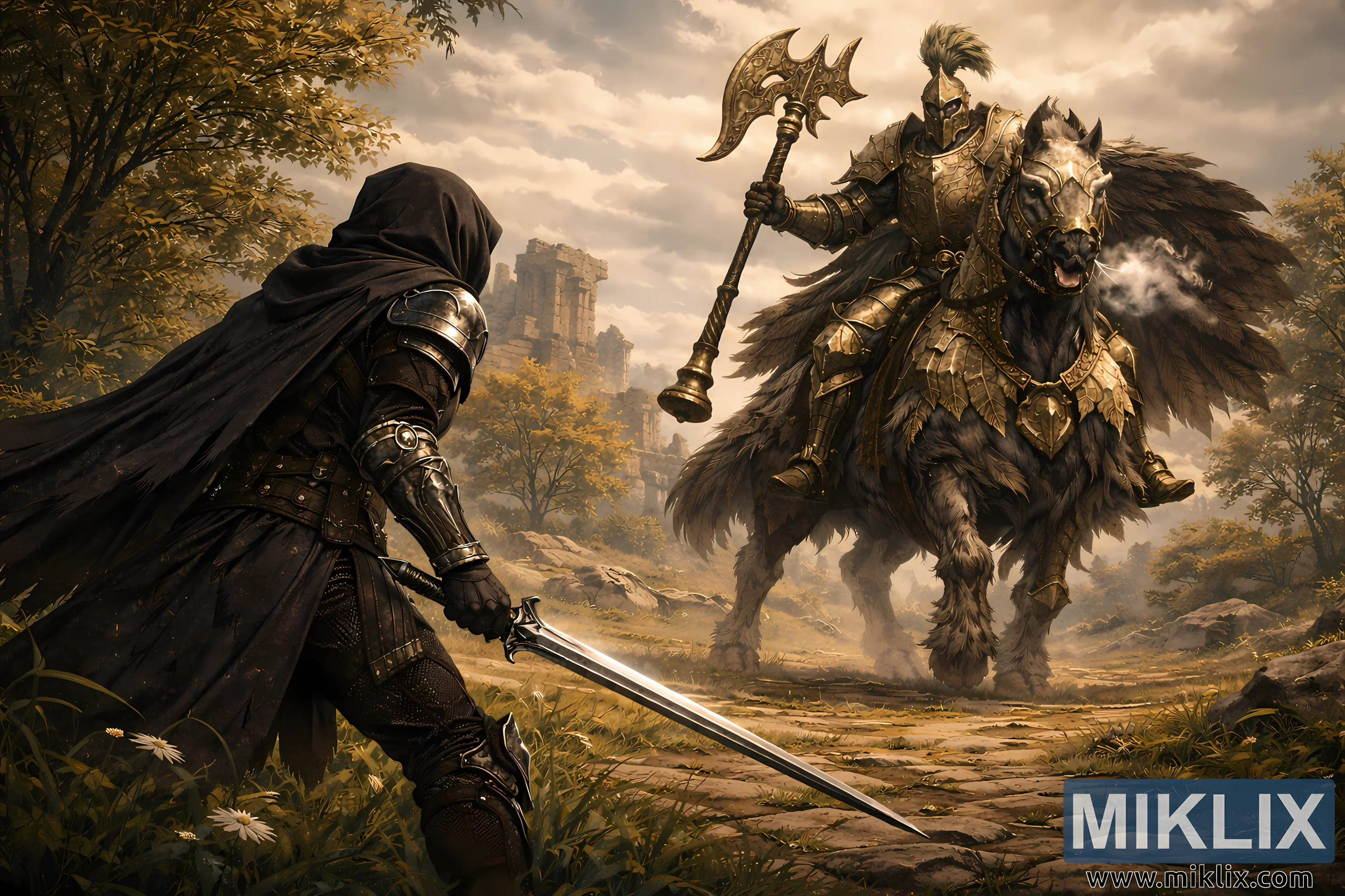 L'ambiente circostante rafforza la tensione drammatica della scena. Ondulati campi erbosi si estendono in lontananza, punteggiati da macchie di fiori selvatici, pietre sparse e sentieri sterrati irregolari che sembrano naturalmente integrati nel terreno. Rovine in secondo piano – archi di pietra spezzati, pilastri fratturati e muri parzialmente crollati – alludono a una civiltà dimenticata da tempo, conferendo un malinconico peso storico all'ambientazione. Alberi con foglie dorate e ambrate incorniciano l'orizzonte, le cui calde tonalità si armonizzano con l'armatura dorata del cavaliere e contrastano con la sagoma più scura del guerriero. In alto, un ampio cielo pieno di nuvole stratificate diffonde la luce del sole, creando morbide sfumature e una realistica prospettiva atmosferica. I raggi di luce filtrano attraverso gli spazi tra le nuvole, proiettando riflessi naturali e ombre allungate sia sulle figure che sul terreno, esaltandone la profondità e la dimensionalità.