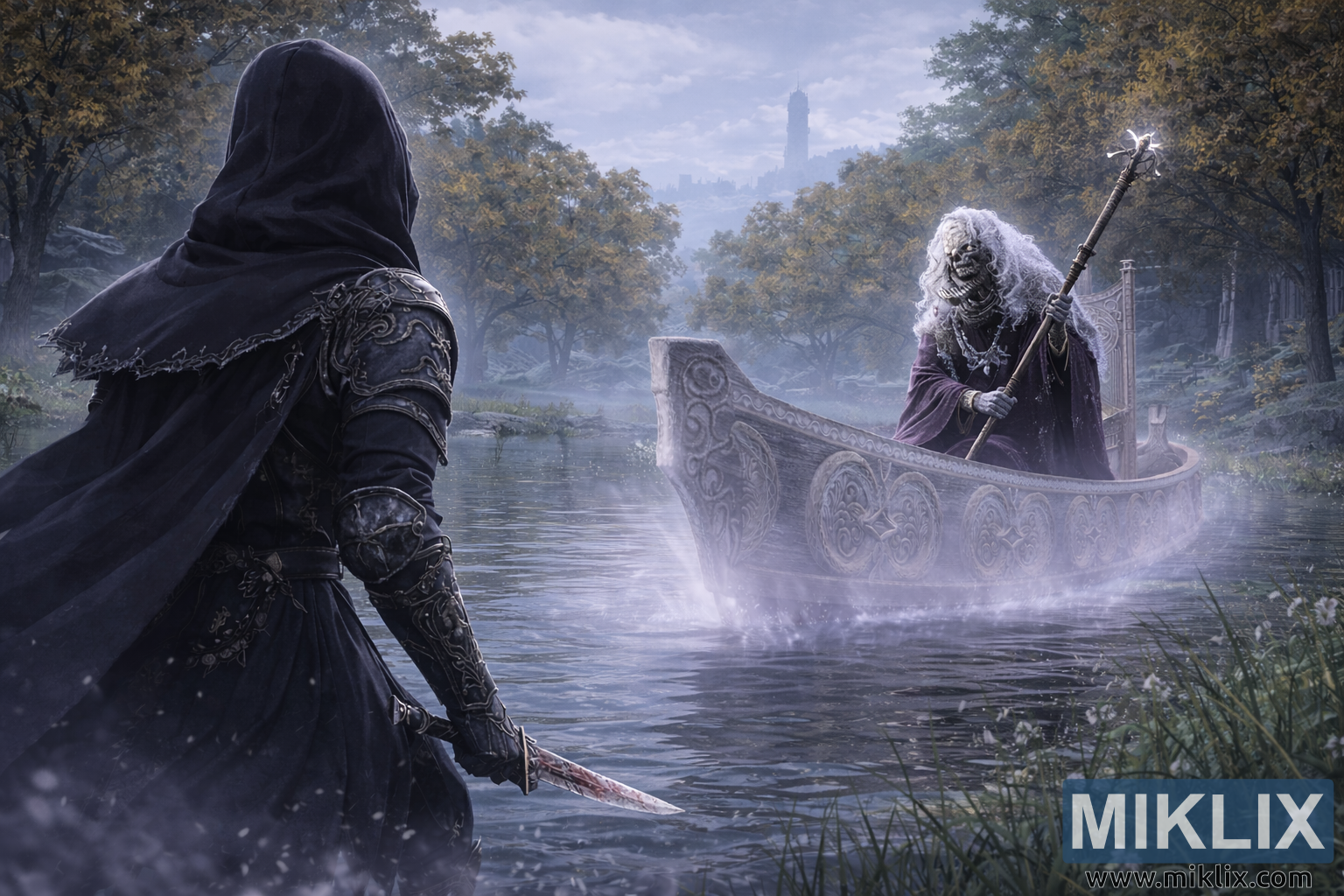 Dall'altra parte dell'acqua, dominando il lato destro della scena, il Tibia Mariner galleggia silenzioso sulla sua barca spettrale. L'imbarcazione sembra scolpita in pietra chiara o osso, ornata da elaborate incisioni circolari e motivi runici ondulati che brillano dolcemente sotto la nebbia fluttuante. La barca non disturba realmente l'acqua, ma scivola appena sopra la sua superficie, lasciando dietro di sé una scia di vapore etereo che confonde il confine tra il fisico e il soprannaturale. Seduto al suo interno c'è il Mariner stesso, una figura scheletrica avvolta in vesti lacere di tenui viola e grigi. Ciuffi di residui simili a brina si aggrappano alle sue ossa, ai suoi capelli e ai suoi indumenti, conferendogli un'aura di fredda e mortale immobilità.