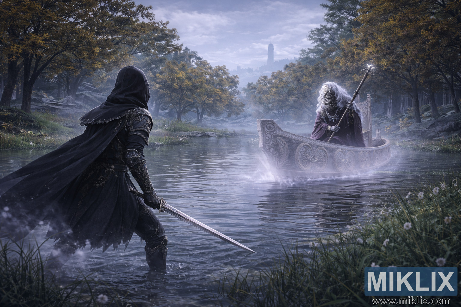 Dall'altra parte dell'acqua, posizionato più a destra e leggermente più in profondità nell'inquadratura, galleggia il Tibia Mariner sulla sua barca spettrale. L'imbarcazione sembra scolpita in pietra chiara o osso, la sua superficie ornata da intricate incisioni circolari e motivi runici sinuosi. Soffi di nebbia eterea fuoriescono dai suoi bordi, dando l'impressione che l'imbarcazione scivoli appena sopra l'acqua piuttosto che attraverso di essa. Il Mariner stesso è una figura scheletrica avvolta in vesti lacere di viola e grigi tenui, il tessuto che pende mollemente da ossa fragili. Residui simili a brina si aggrappano ai suoi capelli, al cranio e agli abiti, accentuando la sua presenza mortale e ultraterrena. Il Mariner impugna un unico lungo bastone intatto, tenuto in posizione verticale con calma rituale. La testa debolmente luminosa del bastone proietta una luce soffusa e spettrale che contrasta sottilmente con la sagoma scura del Tarnished. Le sue orbite vuote sono fissate sul Tarnished, e non trasmettono né rabbia né fretta, bensì un agghiacciante senso di inevitabilità.