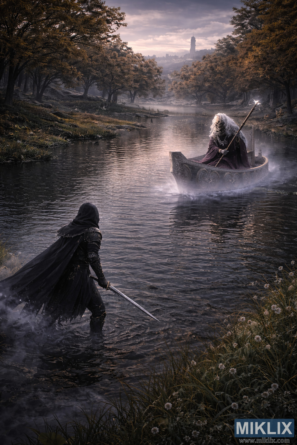 L'illuminazione è soffusa e naturalistica, con cieli nuvolosi che proiettano una luce diffusa sulla scena. Grigi freddi e blu argentati dominano l'acqua e il cielo, in delicato contrasto con i toni dorati caldi e tenui degli alberi autunnali. Le ombre sono morbide e allungate, modellate più dall'atmosfera che dalla luce diretta. Non c'è azione visibile oltre la nebbia che fluttua e l'acqua che scorre lentamente. Piuttosto, l'immagine cattura un momento sospeso di attesa, in cui entrambe le figure si riconoscono l'un l'altra al di là del lago. La prospettiva elevata enfatizza il destino e l'inevitabilità, facendo sembrare il confronto insignificante rispetto al mondo vasto e indifferente, un tratto distintivo del tono di Elden Ring, dove bellezza, malinconia e violenza imminente coesistono in un silenzioso equilibrio.