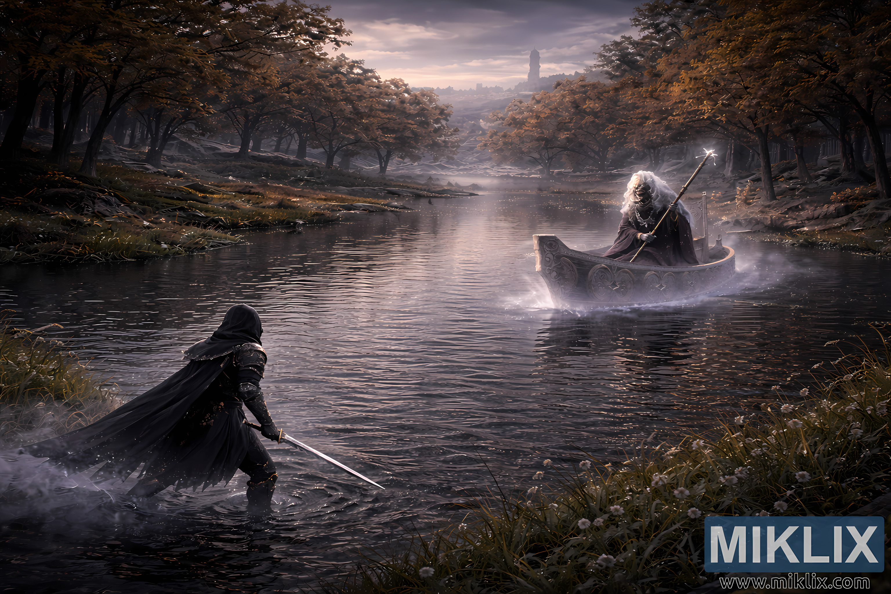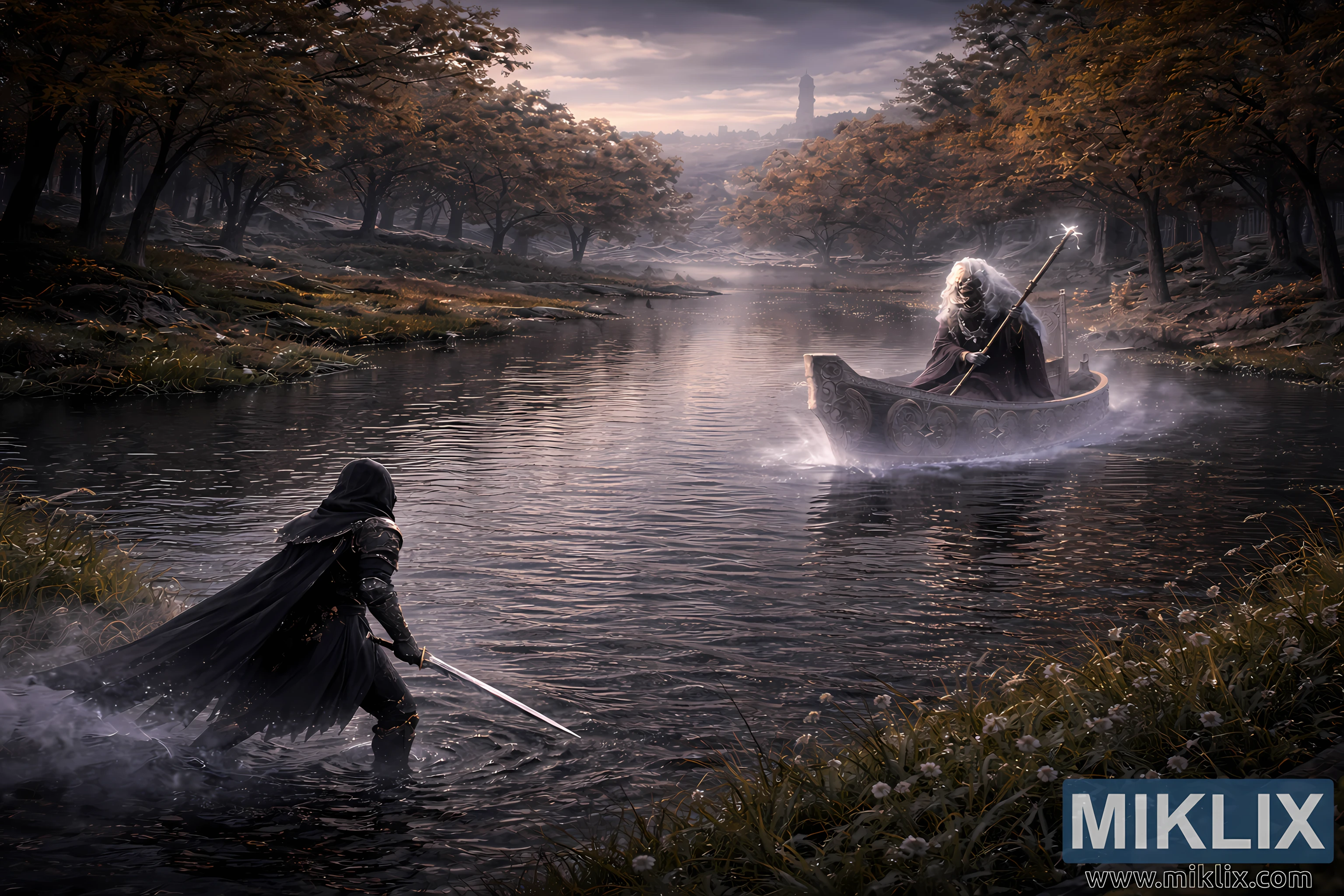 L'illuminazione è diffusa e naturalistica, come filtrata da cieli nuvolosi. Grigi freddi e blu argentati dominano l'acqua e le nuvole, in delicato contrasto con i toni dorati caldi e tenui del fogliame autunnale. Le ombre sono morbide e allungate, modellate dall'atmosfera piuttosto che dalla luce intensa. Non c'è movimento evidente, se non la nebbia fluttuante e l'acqua che scorre lentamente. La scena cattura un momento sospeso di attesa, in cui entrambe le figure sono immobili, in una reciproca consapevolezza, dall'altra parte del lago. La vista elevata e paesaggistica sottolinea quanto piccolo sembri il confronto rispetto al vasto e indifferente mondo, incarnando il tono caratteristico di Elden Ring, fatto di silenzioso terrore, bellezza e inevitabilità, appena prima che la violenza rompa l'immobilità.