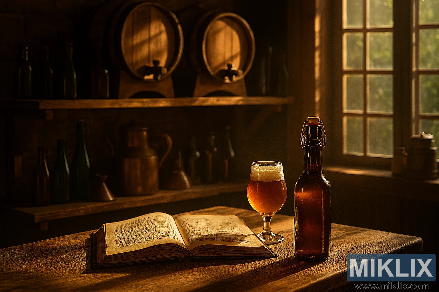 Accanto al libro, è posta in posizione verticale una bottiglia di birra color ambra scuro con tappo a vite rosso e bianco. Accanto, un bicchiere a tulipano pieno di birra ambrata schiumosa brilla alla luce, la cui spessa schiuma bianca cattura i raggi dorati. A sinistra, tre bottiglie di vetro verde di diverse forme e altezze aggiungono ritmo visivo e profondità. Un piccolo imbuto di rame è appoggiato lì vicino, rafforzando il senso di preparazione manuale della birra.