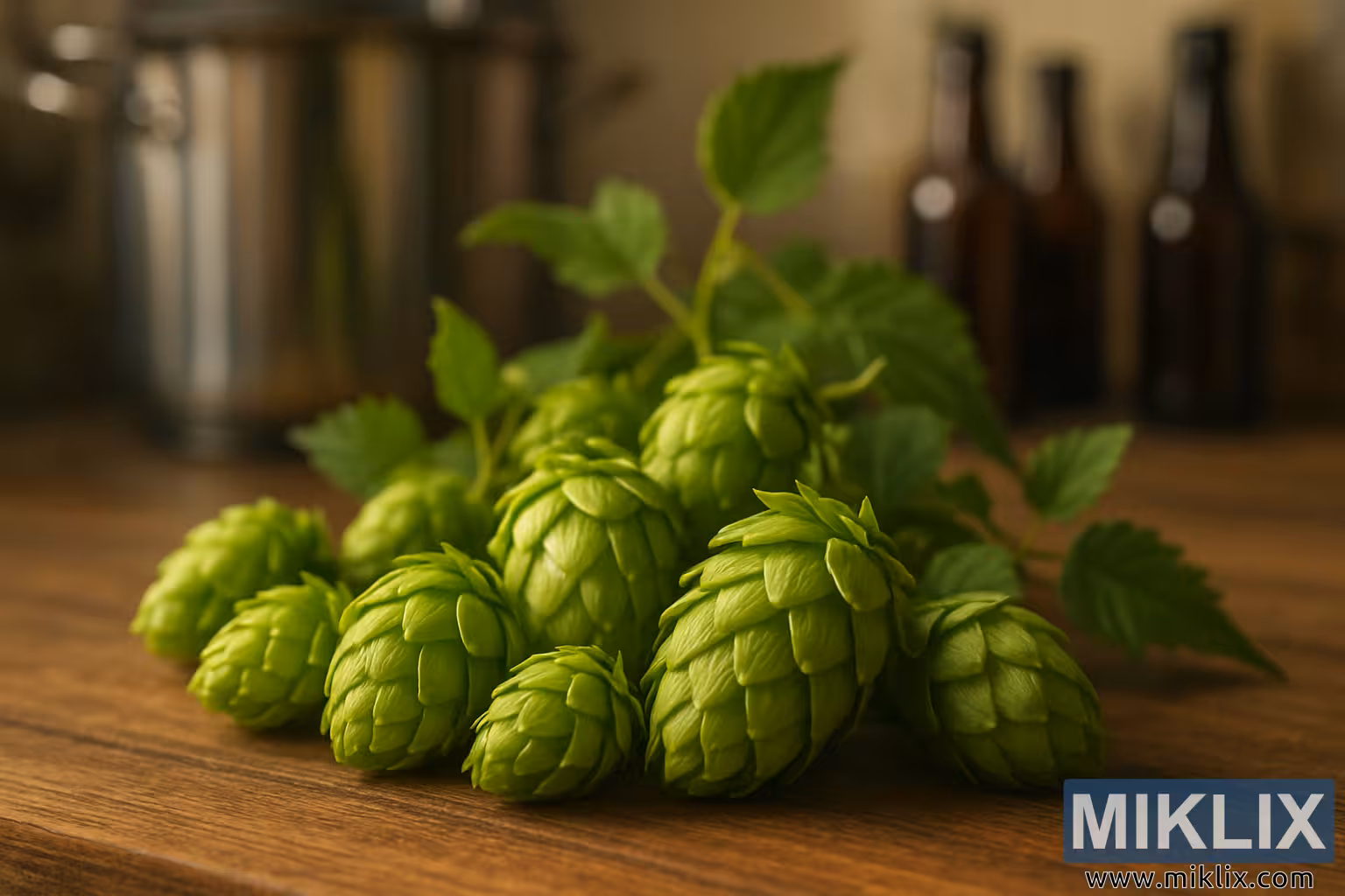 Luppoli Target di un verde brillante su un tavolo di legno, con foglie e attrezzature per la produzione casalinga leggermente sfocate sullo sfondo.