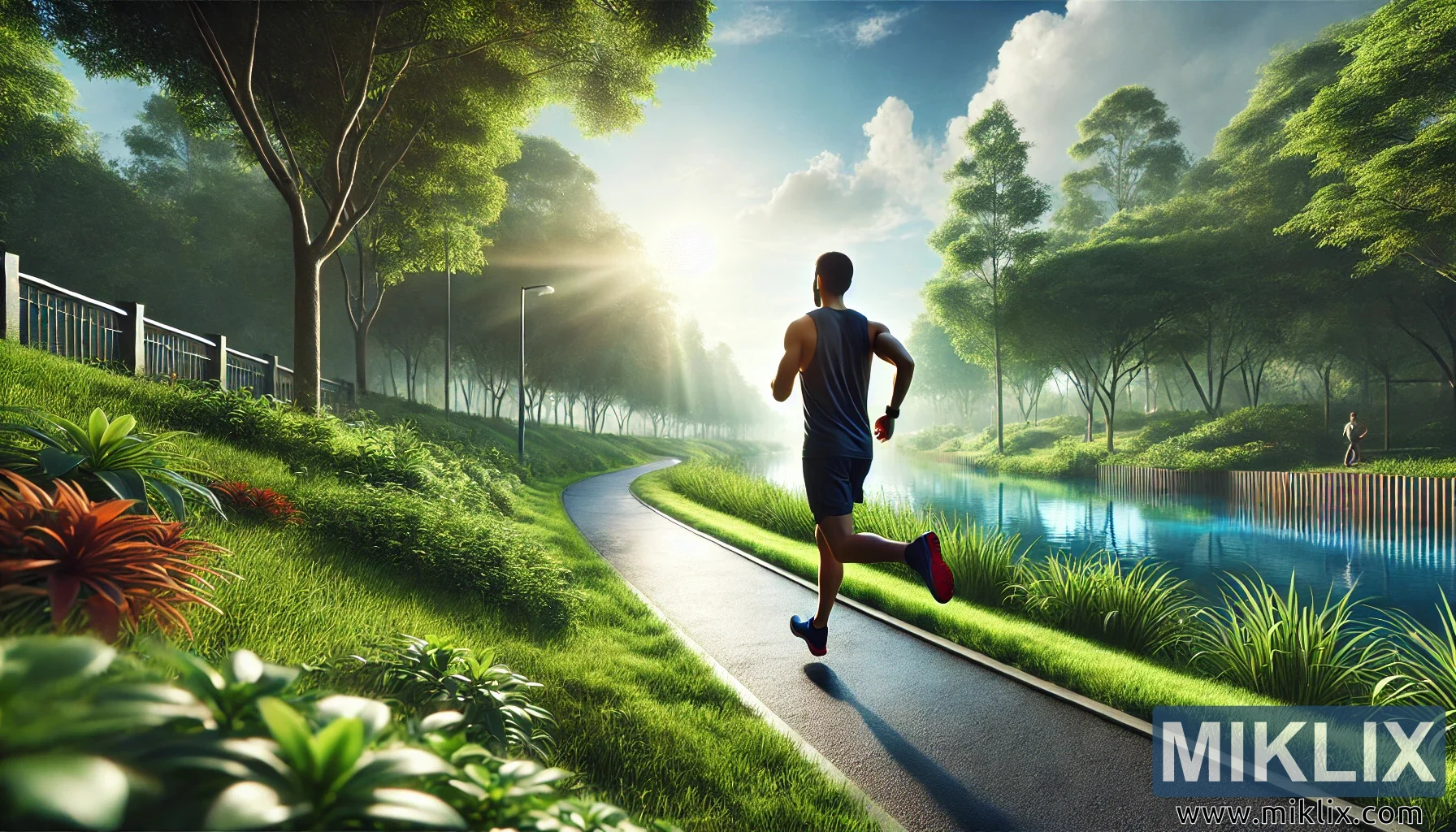 L'immagine dipinge un ritratto vivido e stimolante di salute, movimento e serenità, catturato in un ambiente naturale lussureggiante, che trasmette una sensazione di rinvigorimento e di rigenerazione. In primo piano, un runner occupa il centro della scena, raffigurato a metà passo mentre si muove con grazia lungo un percorso liscio e tortuoso. La sua forma atletica è evidenziata dal gioco di luci sul corpo, con ogni muscolo e movimento che dimostra la potenza e il ritmo dell'attività fisica. La presenza del runner trasmette immediatamente la vitalità e la disciplina che derivano da uno stile di vita attivo, mentre il suo passo costante e la postura eretta evocano concentrazione, determinazione e la semplice gioia del movimento. Questa figura centrale non si limita a fare esercizio, ma incarna il tema più ampio del benessere personale, connettendo corpo, mente e ambiente in un unico atto armonioso.