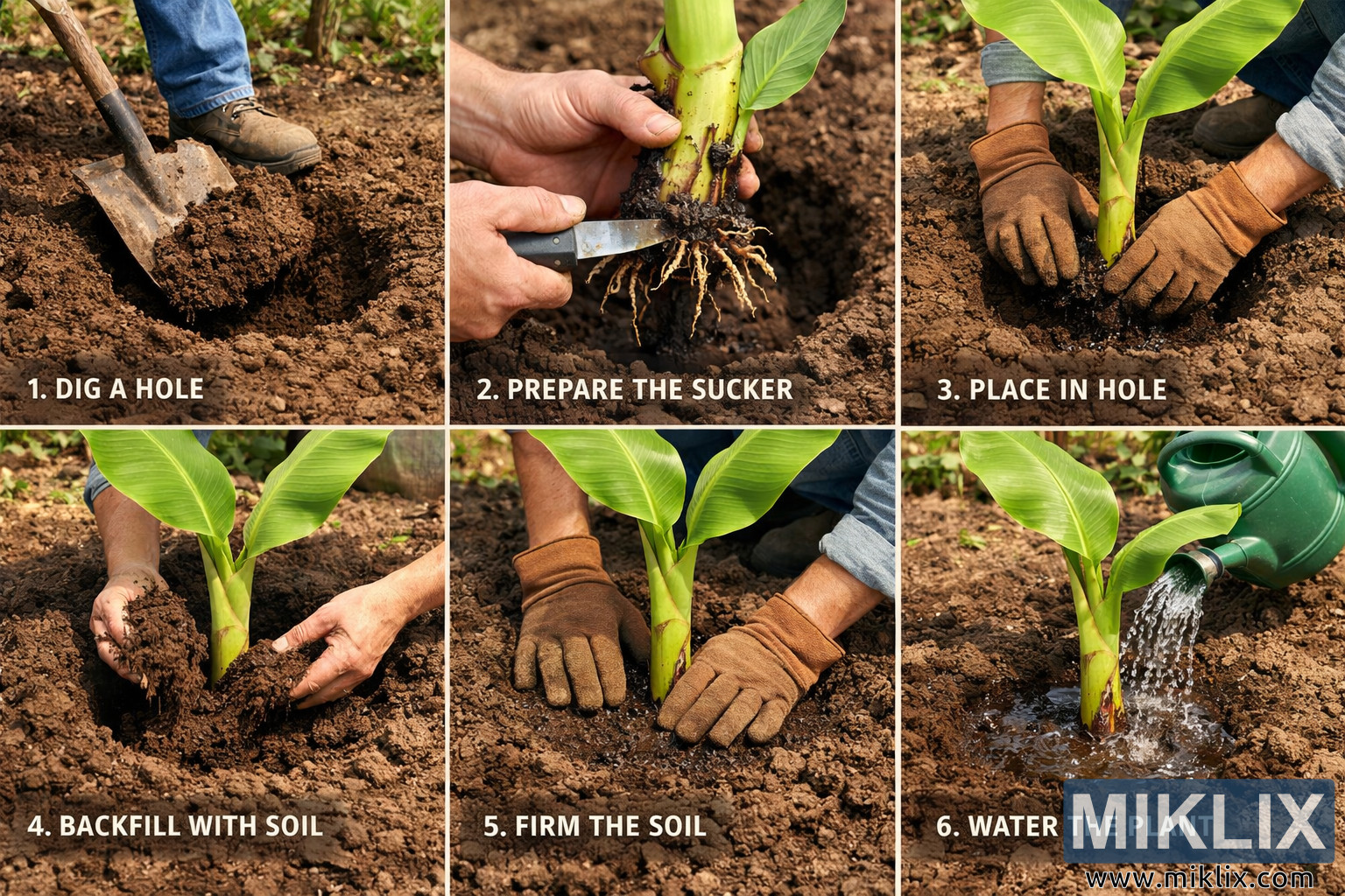 掘削、準備、植え付け、土固め、水やりなど、屋外の庭にバナナの吸芽を植える手順を示す教育的なステップバイステップの画像です。