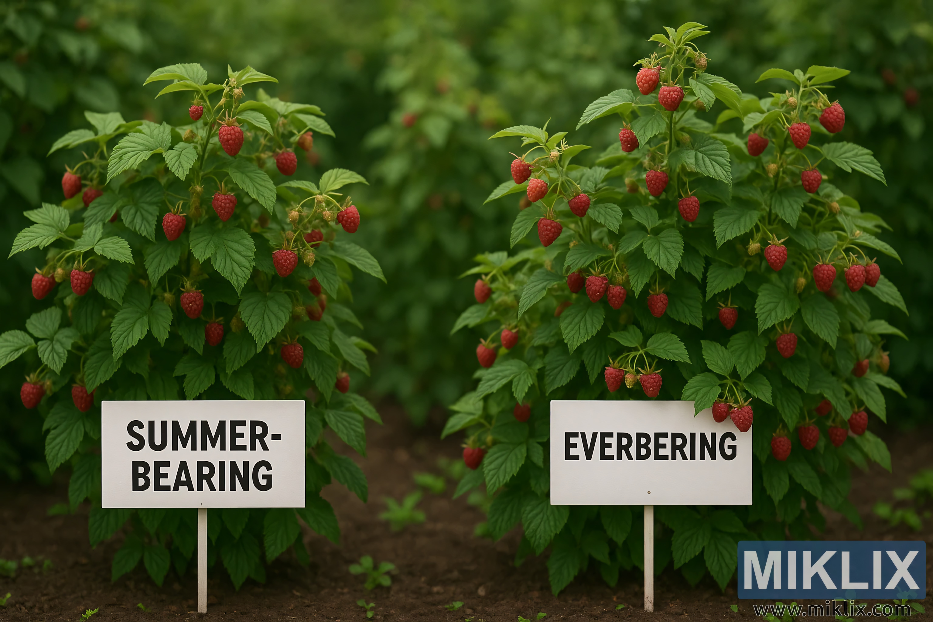 この詳細で高解像度の風景写真には、2 種類のラズベリーの木が並べて明確に比較されています。左側は夏実り性の品種で、右側は四季実り性の品種です。どちらの木も健康で青々と茂り、鮮やかな緑の葉、丈夫な茎、そして熟した赤いラズベリーの房が自然光の中でわずかに輝いています。場面は、手入れの行き届いた庭または農業研究区画に設定されており、土壌は暗く、湿っていて、きちんと管理されています。それぞれの木の前には、白い厚紙またはプラスチックでできた小さな長方形の看板が地面に打ち付けられており、わかりやすいように太い黒のブロック体の文字で書かれています。左側の看板には「夏実り性」、右側の看板には「四季実り性」と書かれています。均一な照明と浅い被写界深度により、2 つの主要な木に視線が集中し、柔らかくぼかされた背景には、遠くに広がるラズベリーの茂みの列が見え、より大規模な農園を示唆しています。
