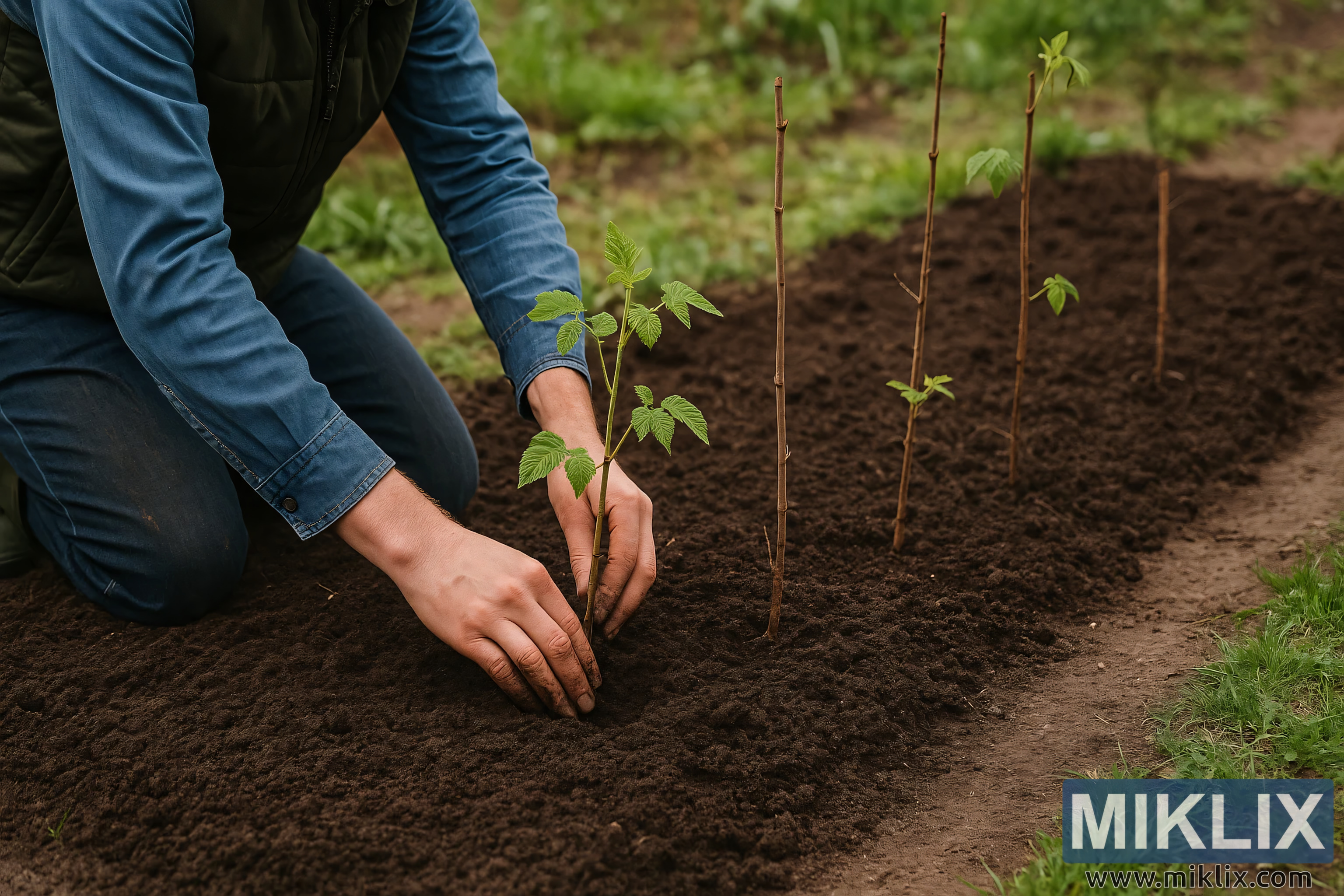庭師が準備された花壇にラズベリーのつるを植えている様子を示す詳細な写真。背景には暗い土と緑の葉が写っています。