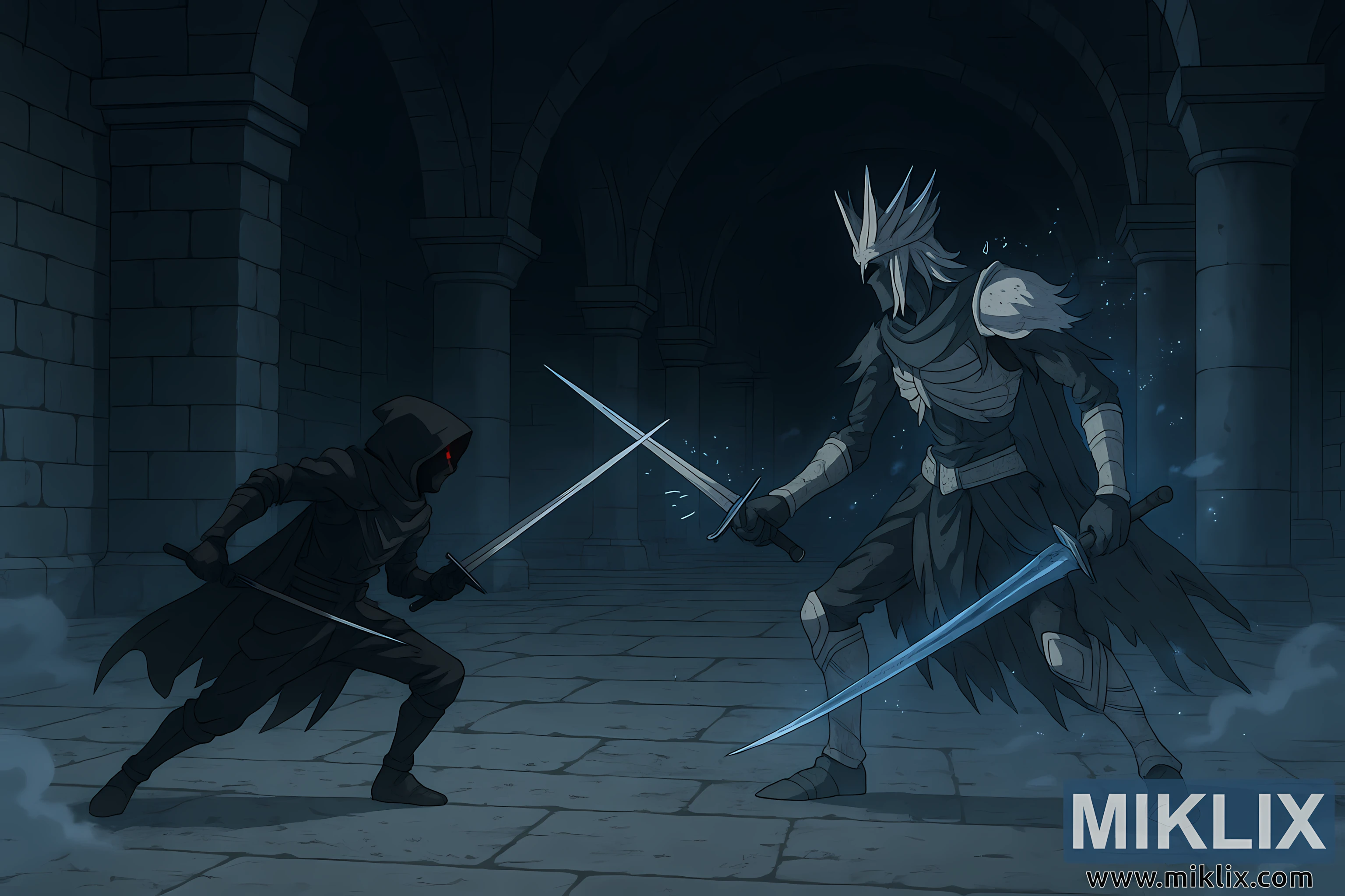 二人の人物の間にある何もない空間は、壁ではなく緊張感によって形作られた舞台と化す。二人の闘士は、緊張感を高めるため、焦点を絞った距離を保ちながら、身構えている。この凍りついた瞬間、まだ一撃も与えられていないが、低い構え、抜かれた刃、そして硬直した姿勢は、見る者に衝突が避けられないことを告げている。主にクールなブルーとグレーを基調とした照明は、彼らの対決の決闘のような様相を強調している。闇の暗殺者と古代の霜の守護者、そして不気味な墓の冷たい石造りの建築物。
