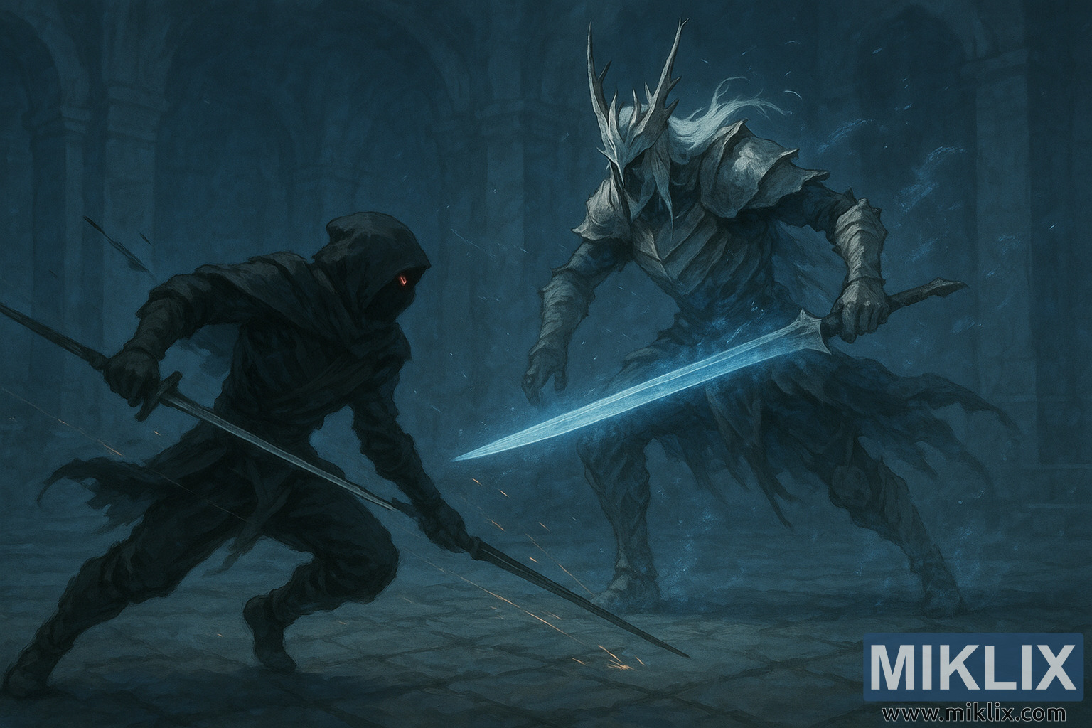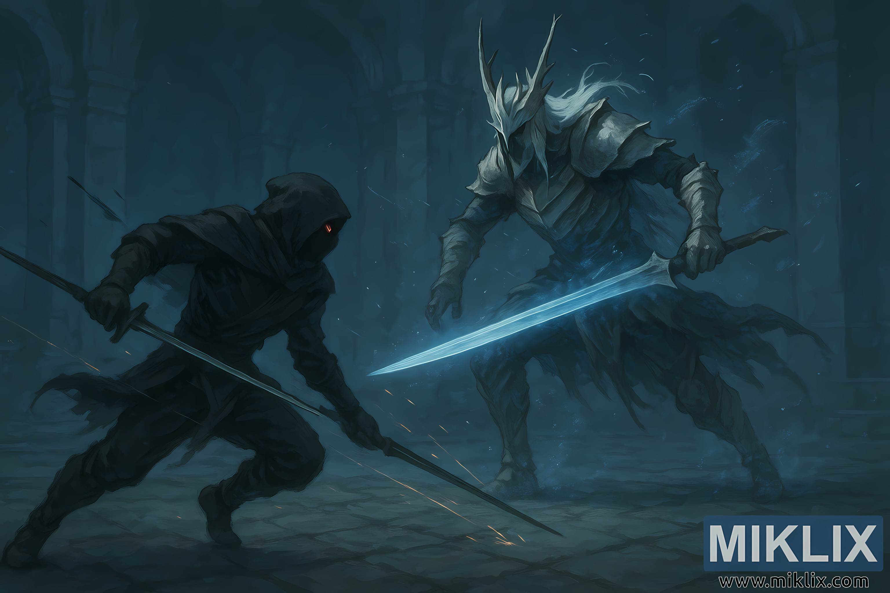 左には、ブラックナイフの暗殺者が躍動感あふれる回避行動の最中を捉えている。体は地面すれすれにひねり上がり、片足に体重を移しながらもう片方の足を後ろに振り上げると、マントがはためいている。ブラックナイフの鎧は、擦り切れて重なり合い、マットな黒色に染まり、周囲の冷たい光を吸収している。暗殺者の赤い片目だけが際立っている。フードの下で激しく輝き、この瞬間の緊迫感と剃刀のように鋭い意識を強調している。湾曲した刃は両方とも抜かれており、片方は体の前で防御的に構え、霜のかかった火花を受け止め、もう片方は素早い反撃に備えて背後に伸ばされている。繊細な金属の刃先は、氷に覆われた環境からの反射光をかすかに捉えている。