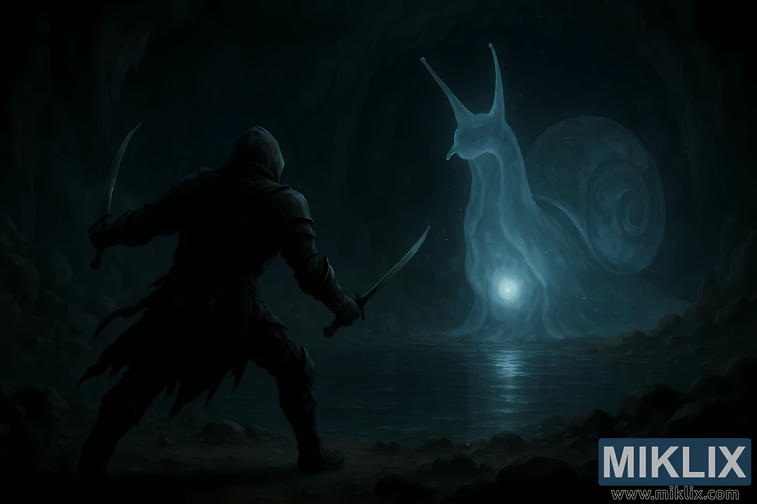 地下の洞窟で光り輝くスピリットコーラー スネイルに向かって前進するブラック ナイフの戦士を描いた、詳細なダーク ファンタジーのイラストです。