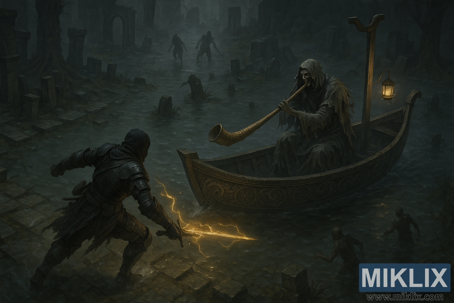 汚れた船の向かい側、中央やや右寄りに、細長い古びた木造船に乗ったティビア船乗りが浮かんでいます。船は重く風雨にさらされ、彫刻された螺旋模様は経年変化、苔、そして水害によって艶を失っています。船内には骸骨のような船乗りが座っており、ぼろぼろで泥にまみれた鈍い灰色と茶色のローブを羽織っています。擦り切れたフードの下から頭蓋骨が覗き、長く湾曲した金色の角を口元に掲げています。以前の穏やかな描写とは異なり、ここでの船乗りの姿勢は防御的でありながらも毅然としており、迫り来る攻撃に備えようとしています。船尾の木の柱に取り付けられたランタンが、かすかに温かい光を放ち、霧をかすかに切り裂き、濡れた木と骨に鮮やかなハイライトを作り出しています。