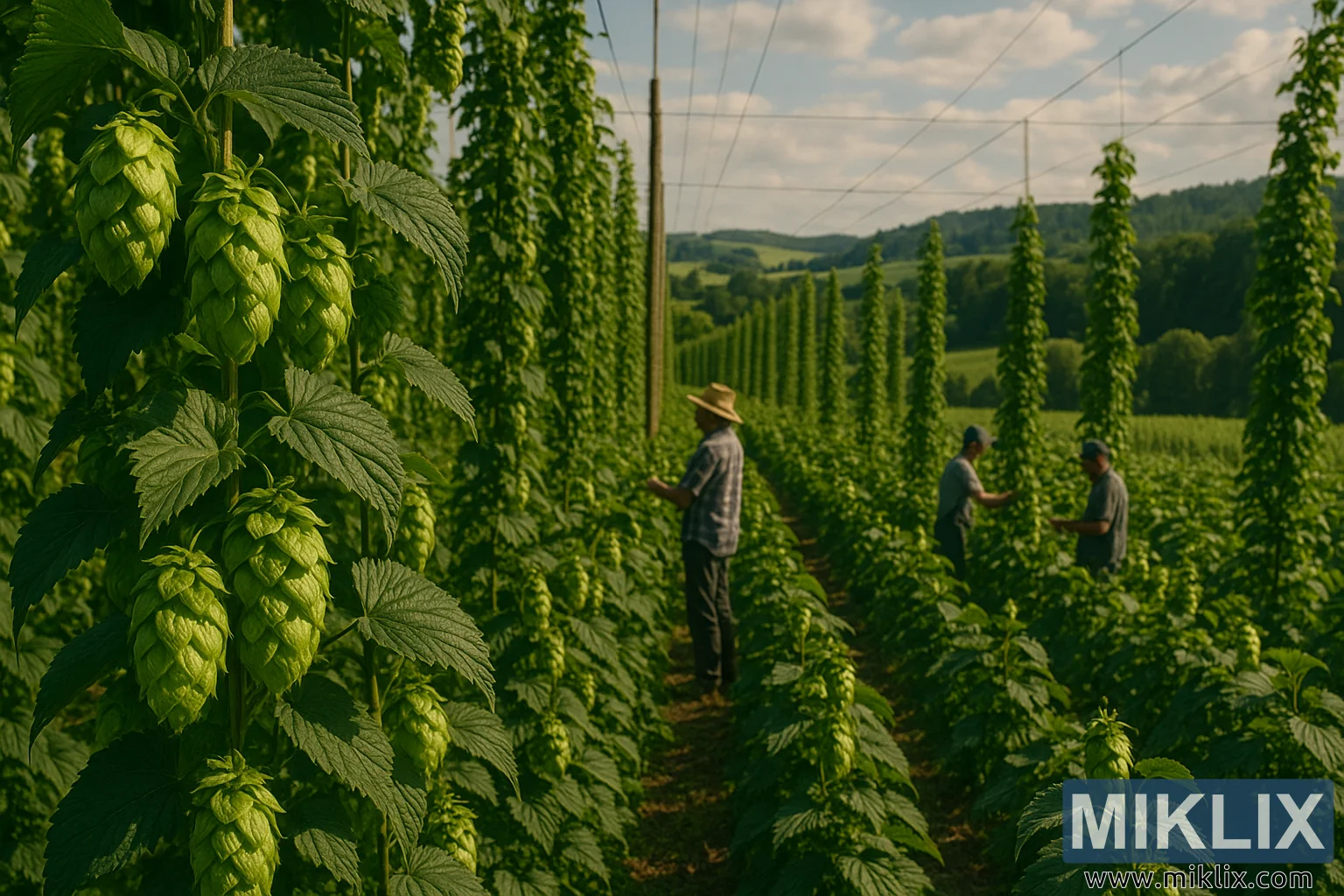 太陽の光に照らされたバイエルンのホップ畑には、生き生きとしたラントホプフェンのつる、密集した松ぼっくり、そして暖かく黄金色の光の中で棚仕立ての列の手入れをする作業員たちの姿が映し出されています。