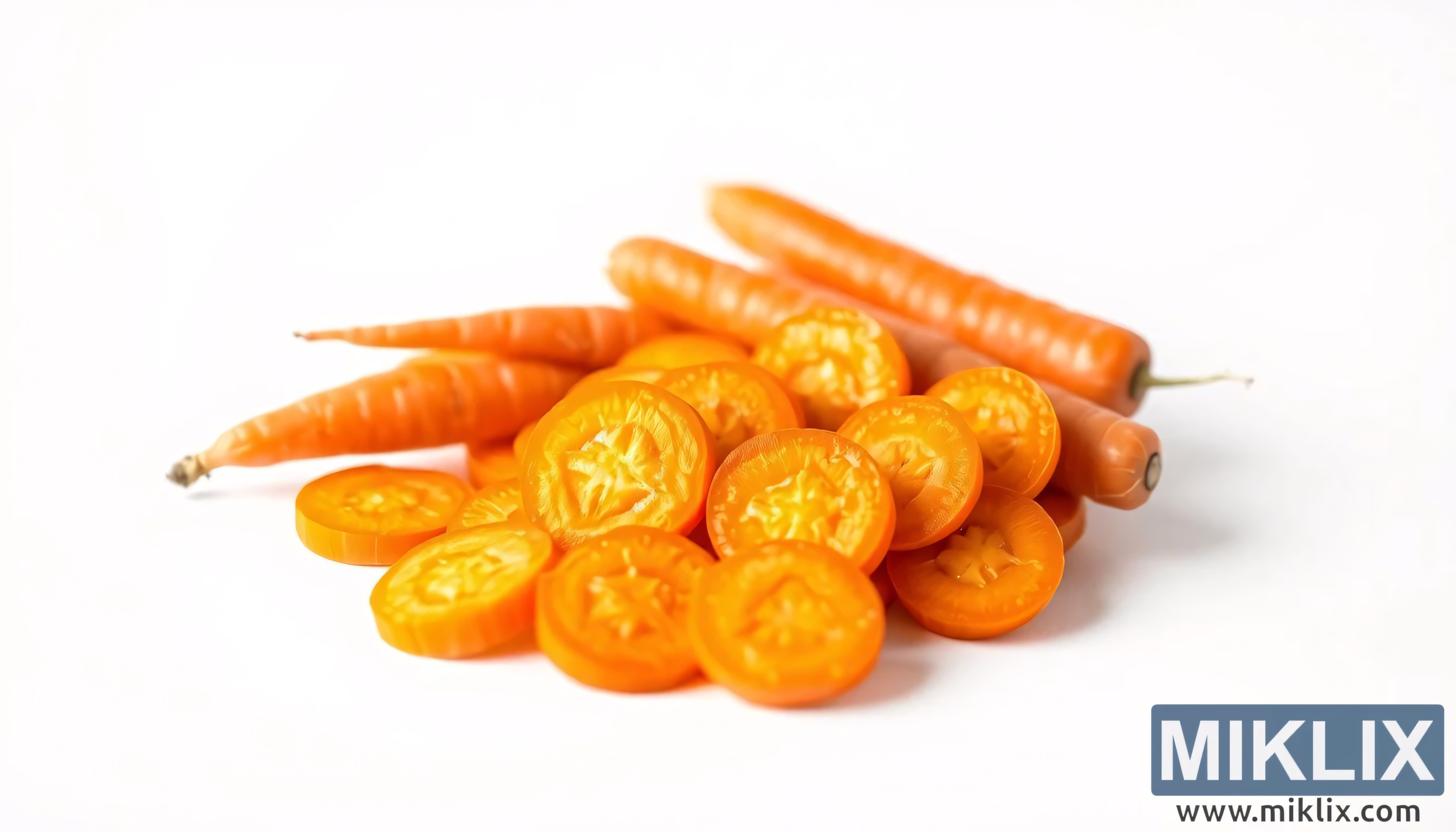 白い背景に鮮やかなオレンジ色のニンジンのスライスのクローズアップ。サクサクした食感、鮮やかな色、豊富な栄養価が強調されています。