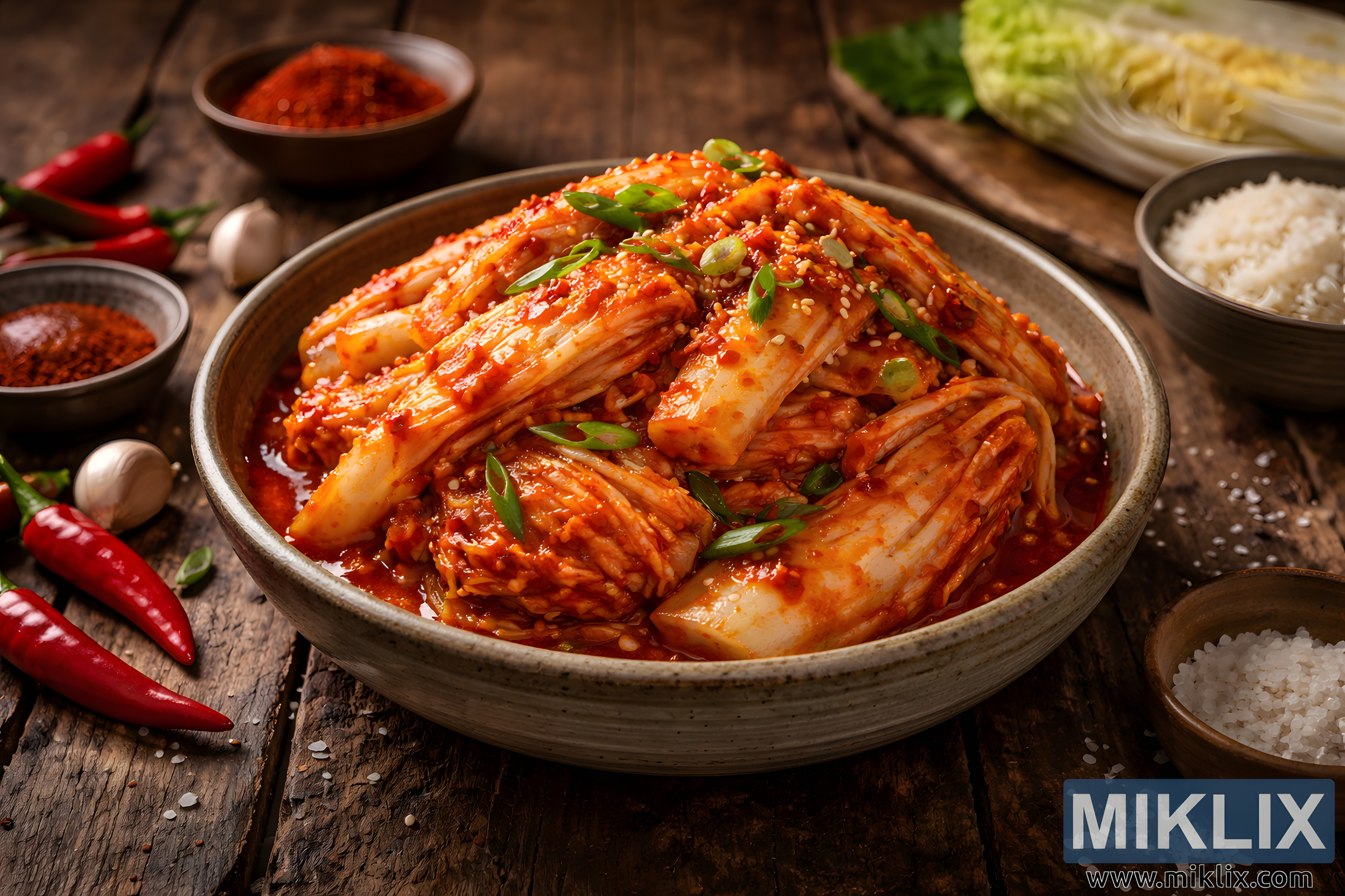 メインの椀の周りには、食材と付け合わせが丁寧に並べられ、この場面のリアリティを高めています。左側には、赤唐辛子が丸ごと数本、木の板の上に無造作に置かれ、皮はぴんと張って光沢を放っています。近くには、ニンニクの小片と、粗挽きの赤唐辛子を詰めた浅い椀が置かれ、料理の背後にある大胆な味付けを暗示しています。右側には、蒸した白米を入れた小さな陶器の椀が、構図に視覚的な間を与えています。その清潔な白さが、キムチの鮮やかな色彩に穏やかな対比を与えています。その後ろでは、淡い緑色の白菜の葉が木のまな板の上に置かれ、発酵していない生の食材を暗示しています。手前に置かれた粗い海塩の小さな椀が、質感と物語のディテールにさらなる深みを与えています。