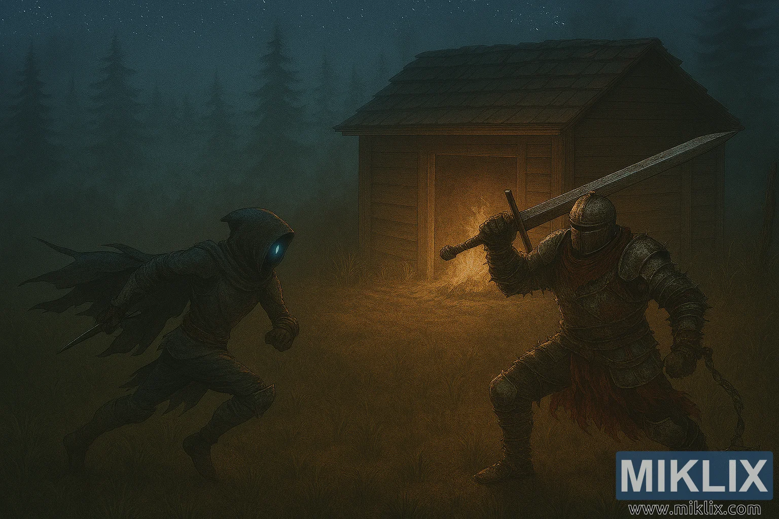 Ilustrasi kanthi resolusi dhuwur lan semi-realistis njupuk tandhing wengi sing tegang ing antarane rong karakter Elden Ring sing apik: waja Tarnished in Black Knife lan Bell-Bearing Hunter. Pemandangan kasebut ana ing njaba gubuk kayu pedesaan sing ana ing alas sing padhet saka wit-witan ijo sing dhuwur. Perspektif ditarik maneh lan diunggahake, menehi tampilan isometrik sing nuduhake terrain ing sakubenge, atap gubuk, lan garis wit-witan sing kabut ing sangisore langit sing kebak lintang.