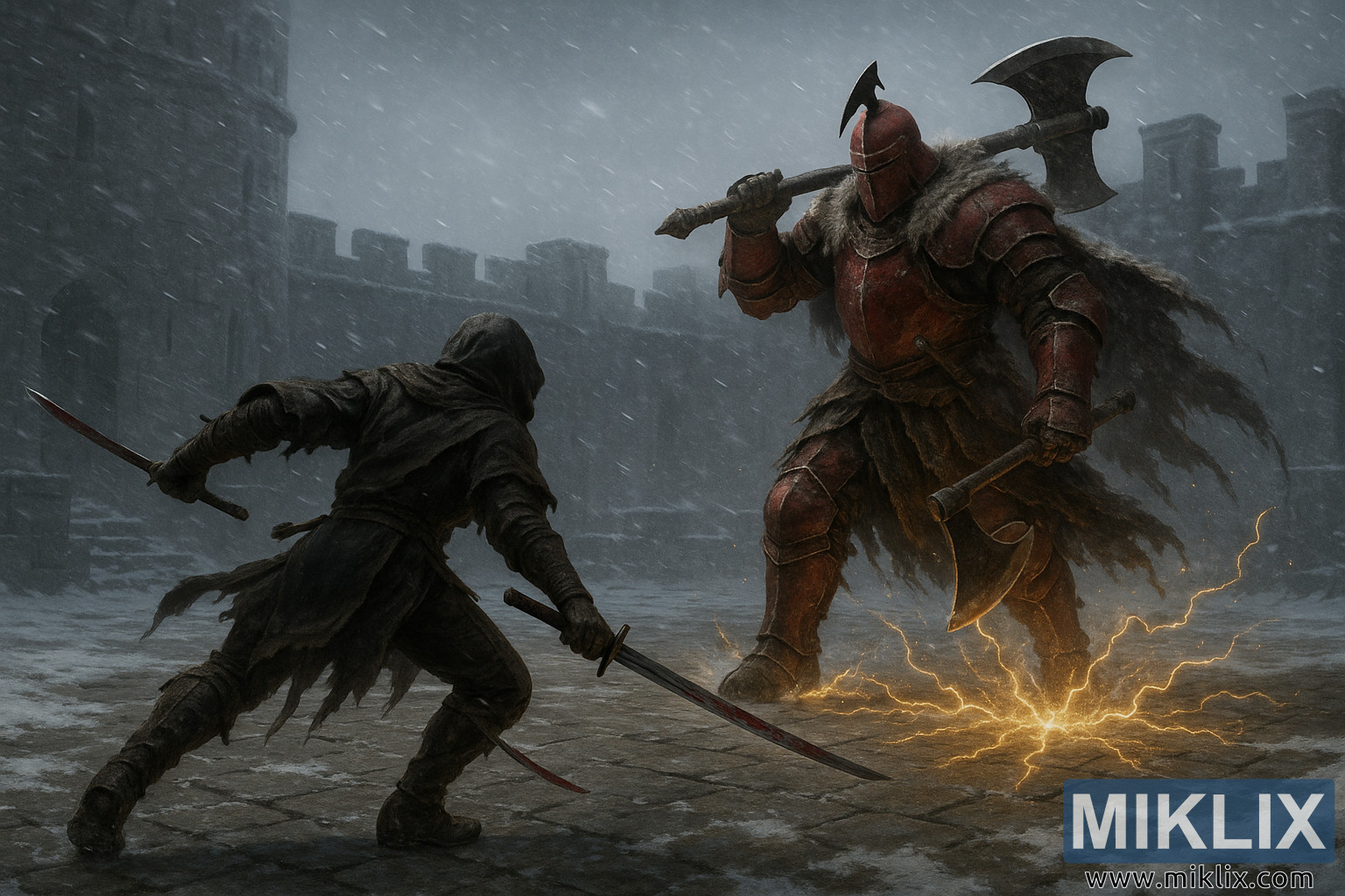 Ilustrasi Fantasi peteng rinci Tarnished ing Black Knife-gaya waja nyerang Panglima Niall, sing nganggo waja abang lan wields kapak massive, ing plataran salju-dijamin Castle Sol.