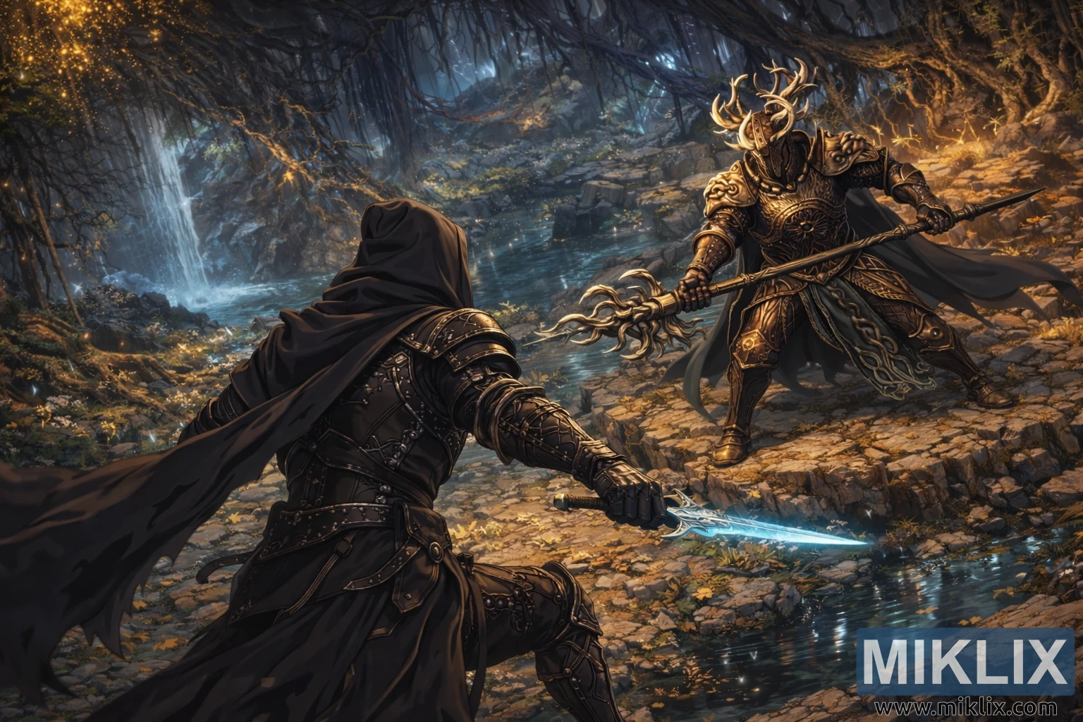 Seni penggemar anime resolusi dhuwur saka Elden Ring kanthi tampilan mburi waja Tarnished in Black Knife sing tabrakan karo Crucible Knight Siluria ing tengah-tengah oyod bioluminescent lan grojogan.