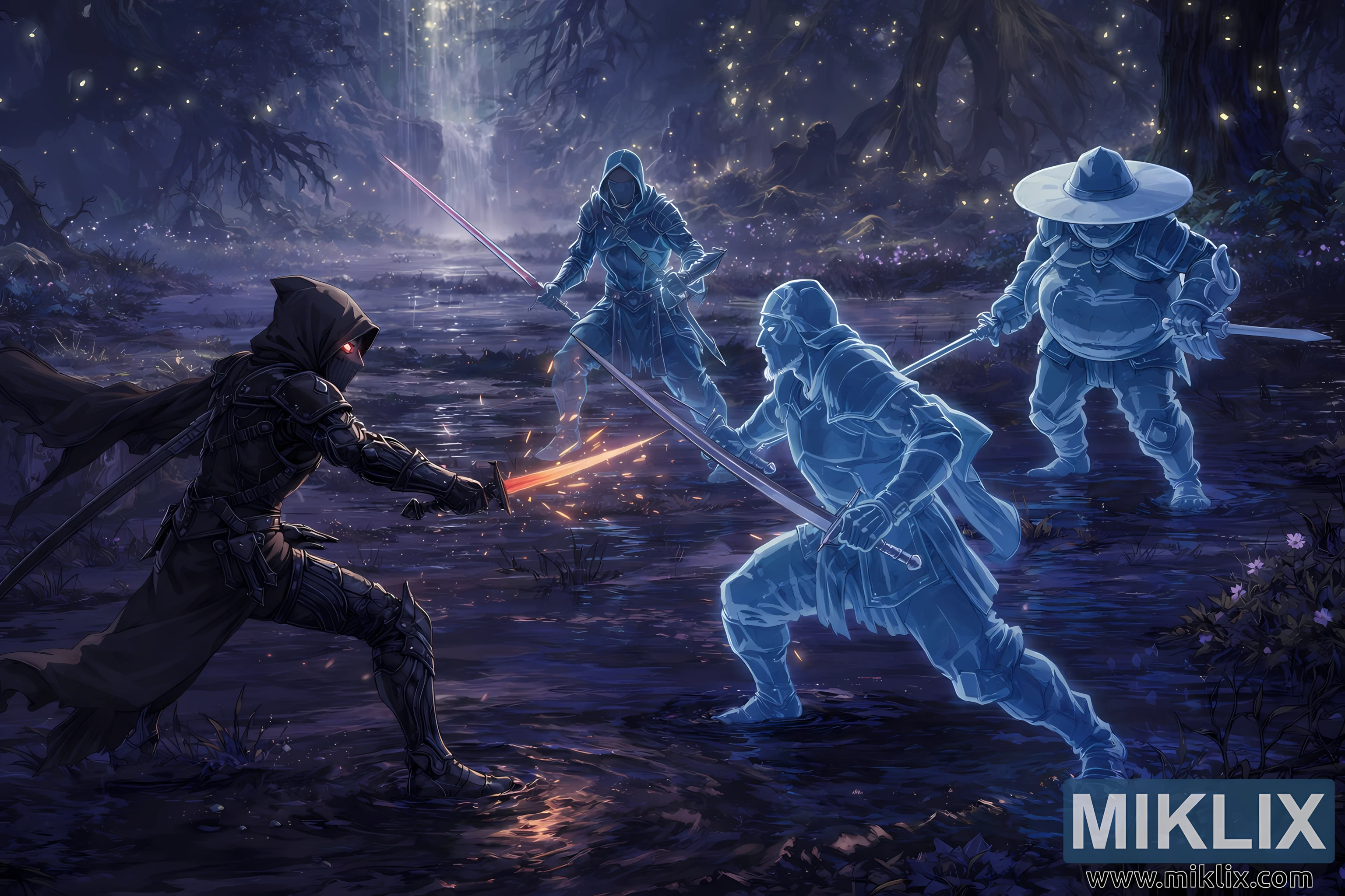 Sing ngelawan Tarnished yaiku Para Juara Fia, sing digambarake minangka prajurit spektral sing dibentuk saka energi biru transparan. Awake katon sebagian ethereal, kanthi waja lan sandhangan sing digarisake ing garis-garis mencorong sing sumunar kaya cahya rembulan ing kabut. Siji Juara maju karo pedhang, lading diangkat kanthi agresif nalika banyu nyiprat ing sikile. Liyane ngadeg ing mburi, senjata ditarik lan postur dijaga, dene sing katelu ngadeg ing sisih nganggo topi sing amba, nguatake macem-macem lan ancaman klompok kasebut. Ekspresine ditutupi dening cahya memedi, nggawe dheweke rumangsa kurang manungsa lan luwih kaya gema pahlawan sing gugur sing kaiket dening tugas.