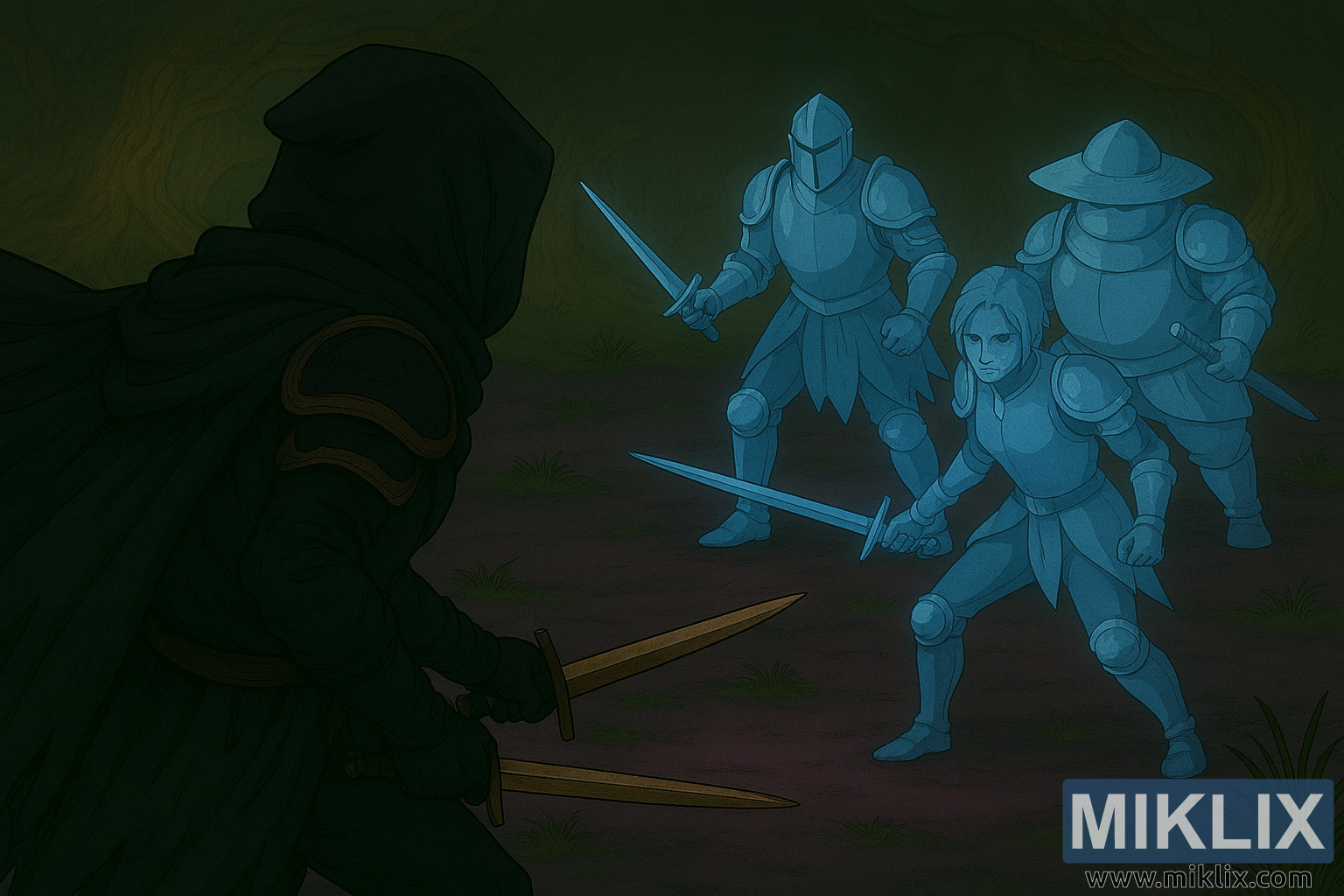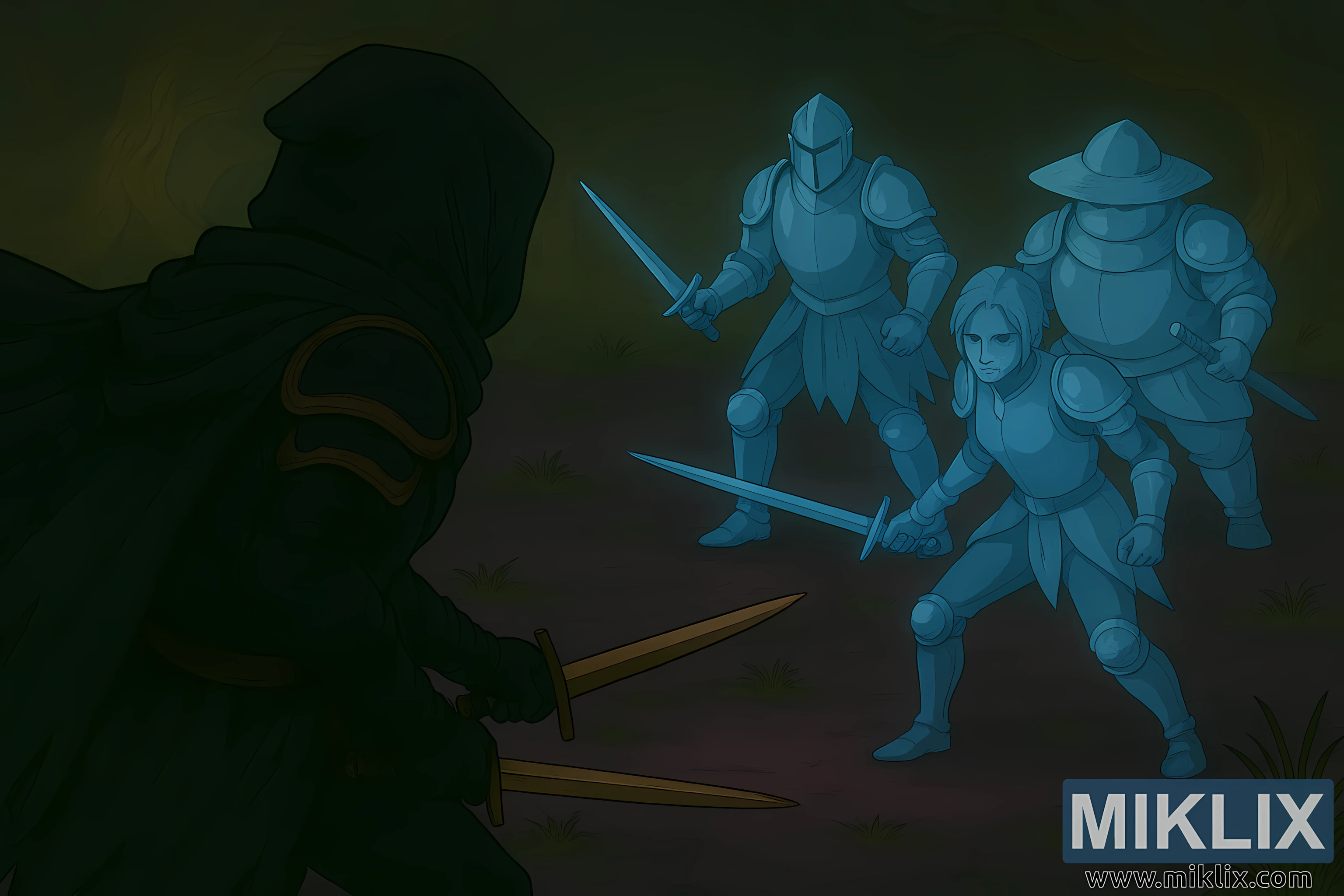 Ngadhepi dheweke ana telung prajurit spektral, saben-saben katon warna biru transparan sing mencorong sing kontras banget karo wujud peteng Tarnished. Juara tengah yaiku ksatria sing nganggo waja abot kanthi helm lengkap lan jubah sing mili. Dheweke ngadeg dhuwur lan megah, nyekel pedhang dawa ing tangan loro, miring munggah kanthi posisi siap perang. Wajane dihias nganggo pauldron sing dikuatake, pelat dada sing amba, lan pelindung sing tersegmentasi.