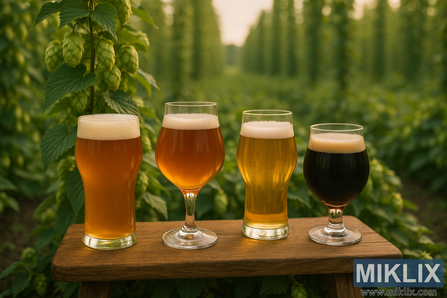 Gambar: Craft Beer Flight karo Groene Bel Hops ing Sunlit Field