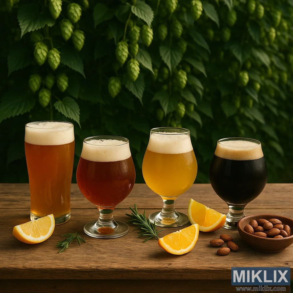 Meja kayu pedesaan kanthi papat bir artisanal, irisan jeruk, jamu, lan kacang-kacangan, dibingkai dening tanduran anggur Groene Bel hop sing subur kanthi cahya alami sing alus.