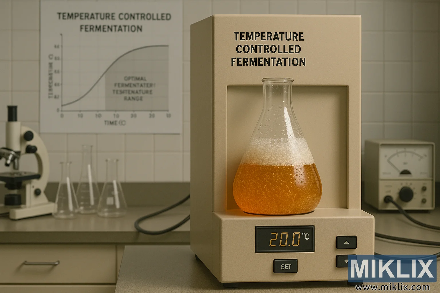 Pemandangan laboratorium sing tepat sing nampilake ruang fermentasi sing dikontrol suhu kanthi ale emas lan peralatan ilmiah.