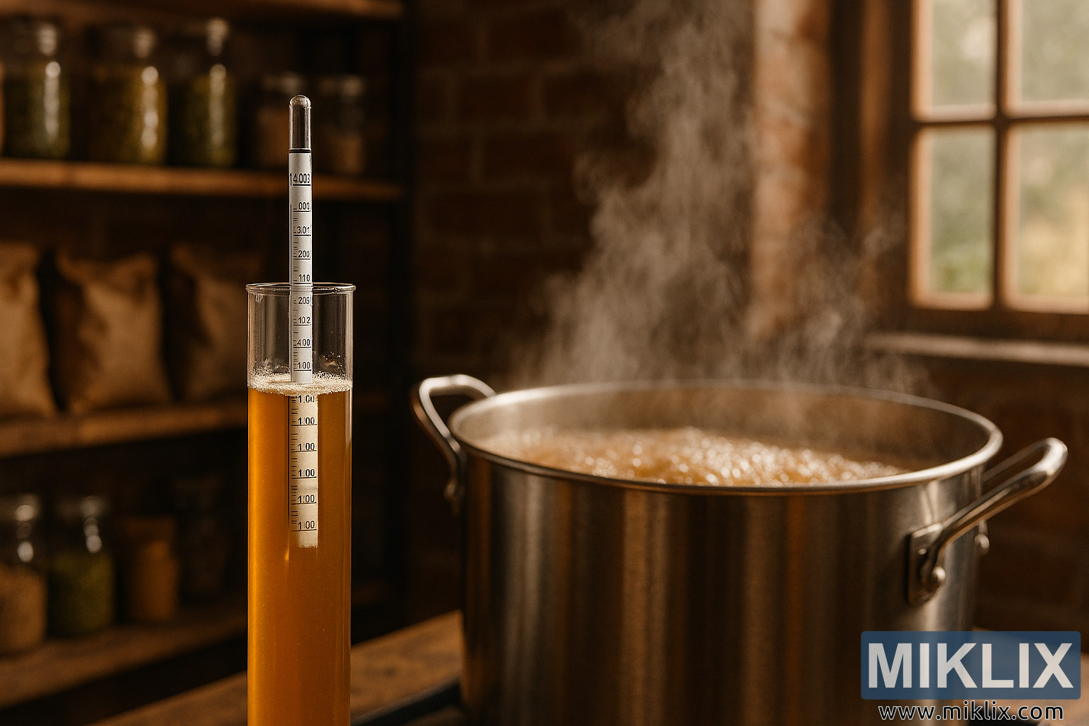 Pemandangan pembuatan bir artistik sing nampilake pangukuran gravitasi wort WLP1983, ketel baja tahan karat, lan cahya sekitar sing nyaman.