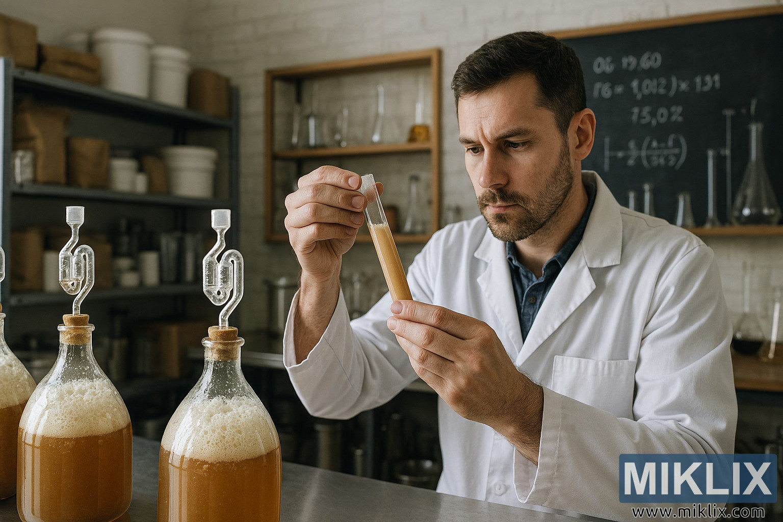 Tukang bir profesional ngukur ragi kanthi tliti ing ruang kerja pabrik bir sing padhang lan teratur, diubengi wadhah fermentasi, peralatan pembuatan bir, lan barang pecah belah ilmiah.