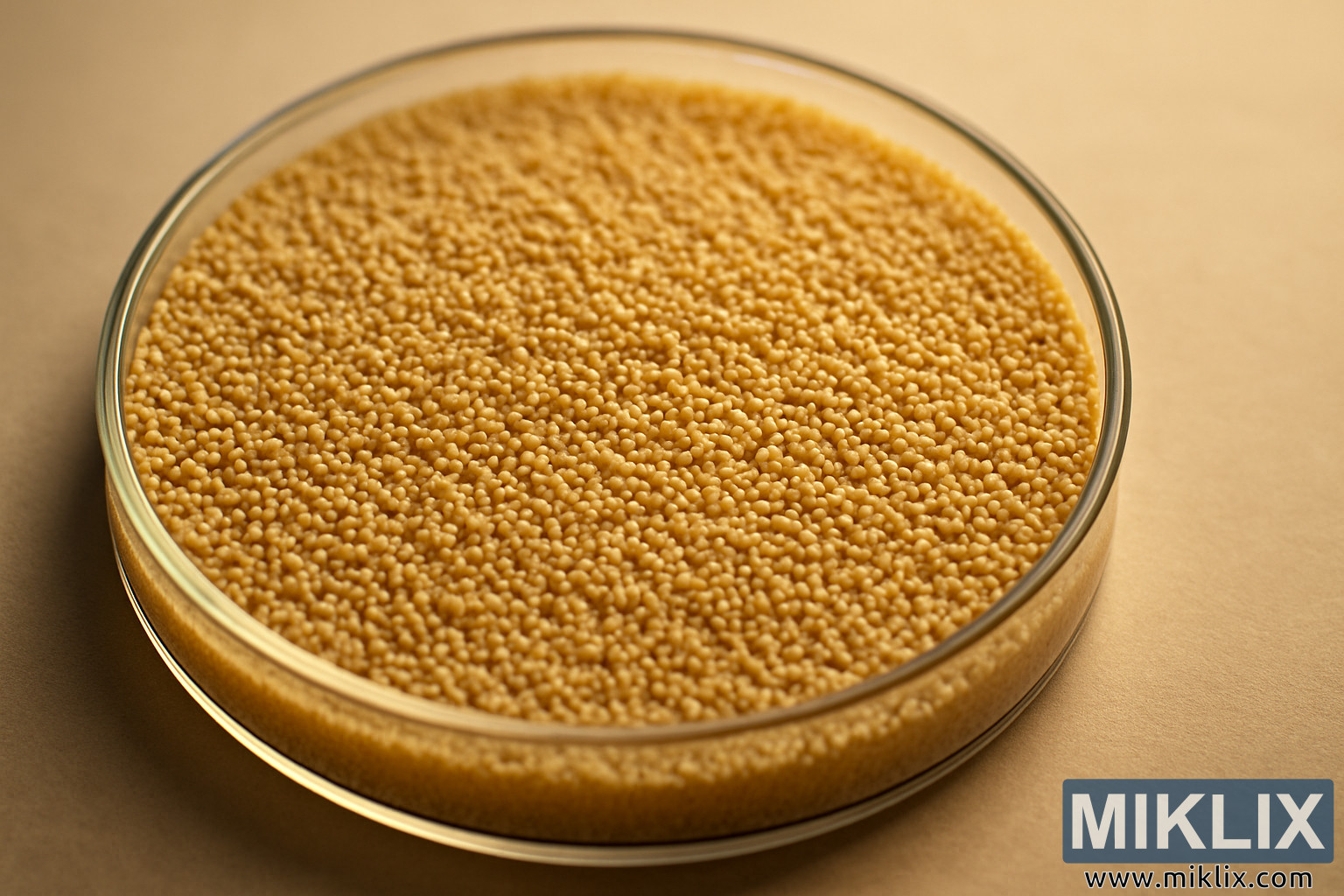 Budaya ragi dhewe ndominasi pigura-massa expansive, tightly dikempalken saka sel ragi cilik bunder sing nggawe granular, meh beaded tekstur. Sèl-sèl kasebut katon seragam nanging beda-beda sacara organik, mbentuk permukaan sing menarik kanthi visual sing nuduhake konsistensi biologis lan irregularity alam. Werna iku kuning emas sing anget, ditambah karo cahya sekitar, sing ngetokake bayangan mikro ing antarane sel individu lan nandheske kasugihan sakabèhé tekstur koloni. Asilé minangka rasa dimensi sing nggumunake, kaya sing ndeleng bisa nyedhaki lan ngrasakake struktur tactile sing apik saka lapisan ragi.