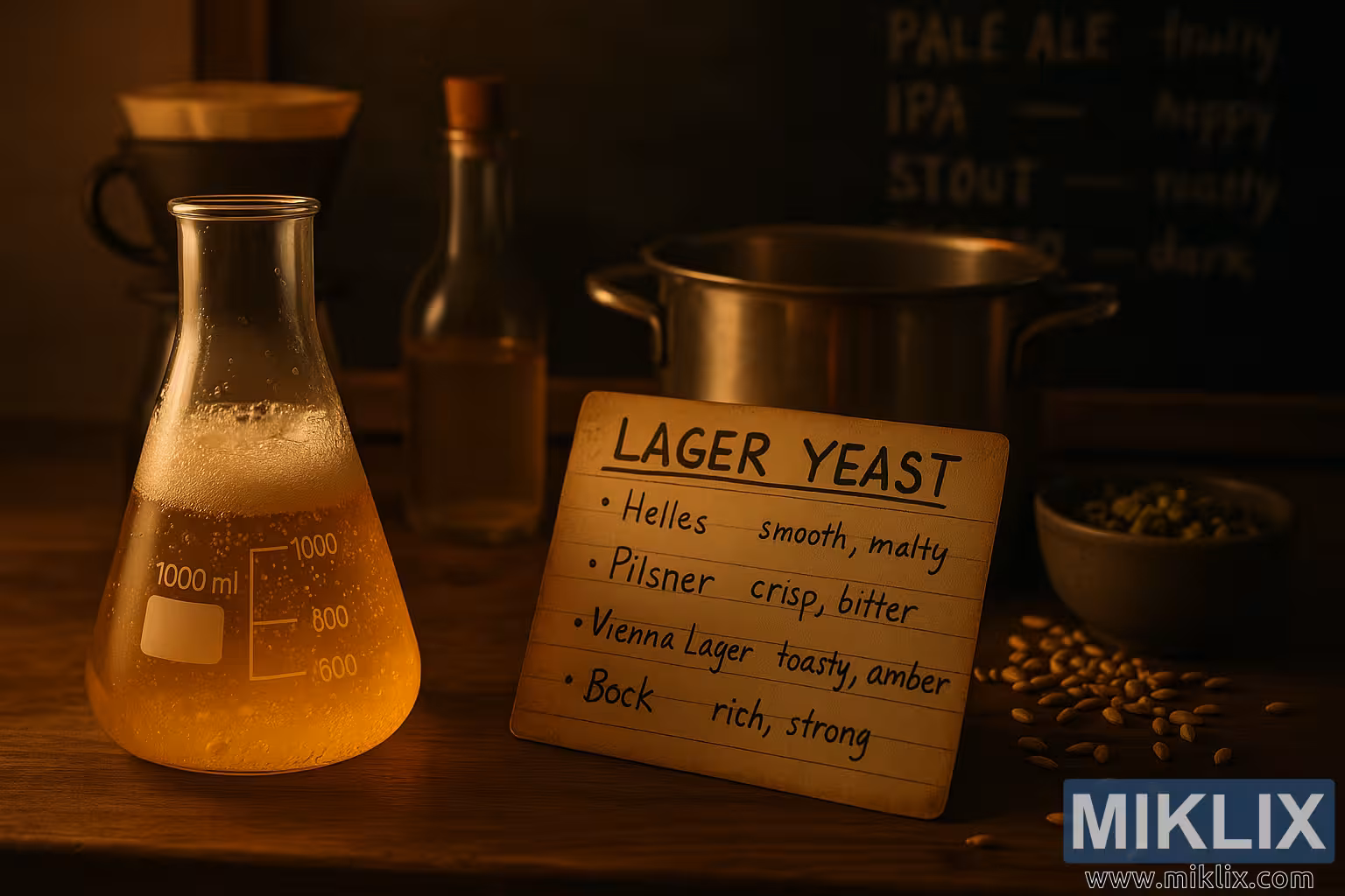 Adegan nggawe bir pawon sing nyenengake lan nyenengake sing nampilake beaker sing bergelembung, cathetan ragi lager tulisan tangan, lan papan tulis gaya bir, sing ndadekake tradisi lan eksperimen.