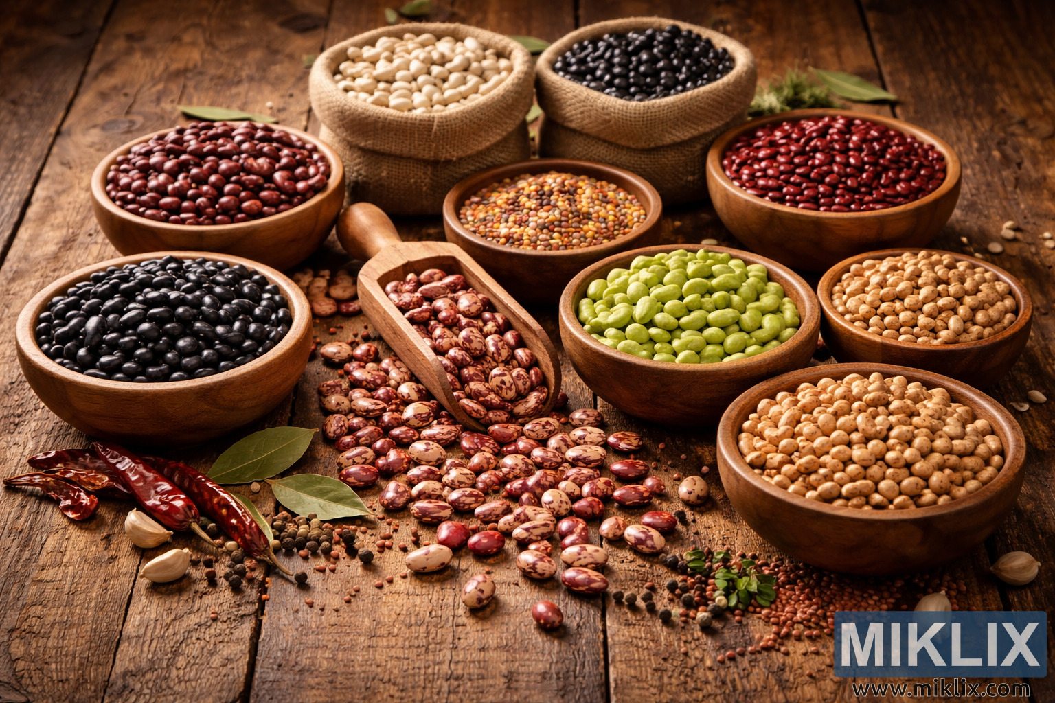 Gambar still life sing amba lan sinematik nyebar ing meja kayu sing wis lawas, papan-papane diukir nganggo goresan lan patina coklat anget sing nuduhake panggunaan sing suwe ing pawon desa. Ing tengah komposisi kasebut ana sendok kayu sing miring maju, numpahi kacang cranberry bintik-bintik sing kulit marmer nyekel cahya alus sing arah. Ing sakubenge titik fokus iki ana susunan mangkuk lan karung goni sing akeh, saben-saben diisi nganti pinggir karo macem-macem kacang garing, mbentuk palet sing sugih saka nada lemah lan kontras sing alus. Kacang ireng jero sumunar kaya watu polesan ing mangkuk kayu sing alus ing sisih kiwa ngisor, dene ing sacedhake karung kacang cannellini putih krem muncul kaya bukit cilik, tekstur goni sing kasar nambah pesona pedesaan.
