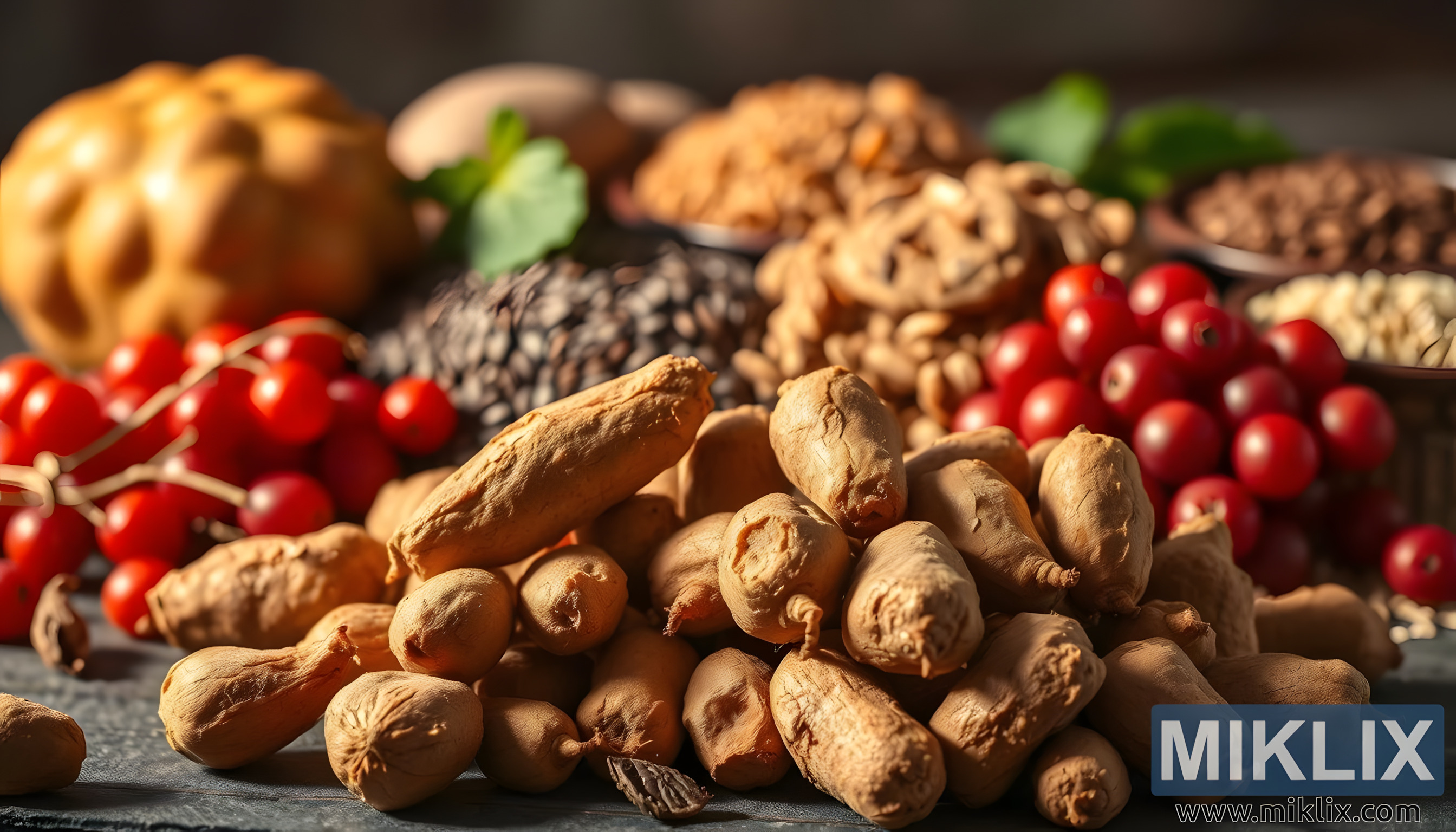 Isih urip saka oyod maca karo panganan super kayata goji berries, wiji chia, lan quinoa, nglambangake vitalitas, kesehatan, lan keuntungan kesehatan alami.