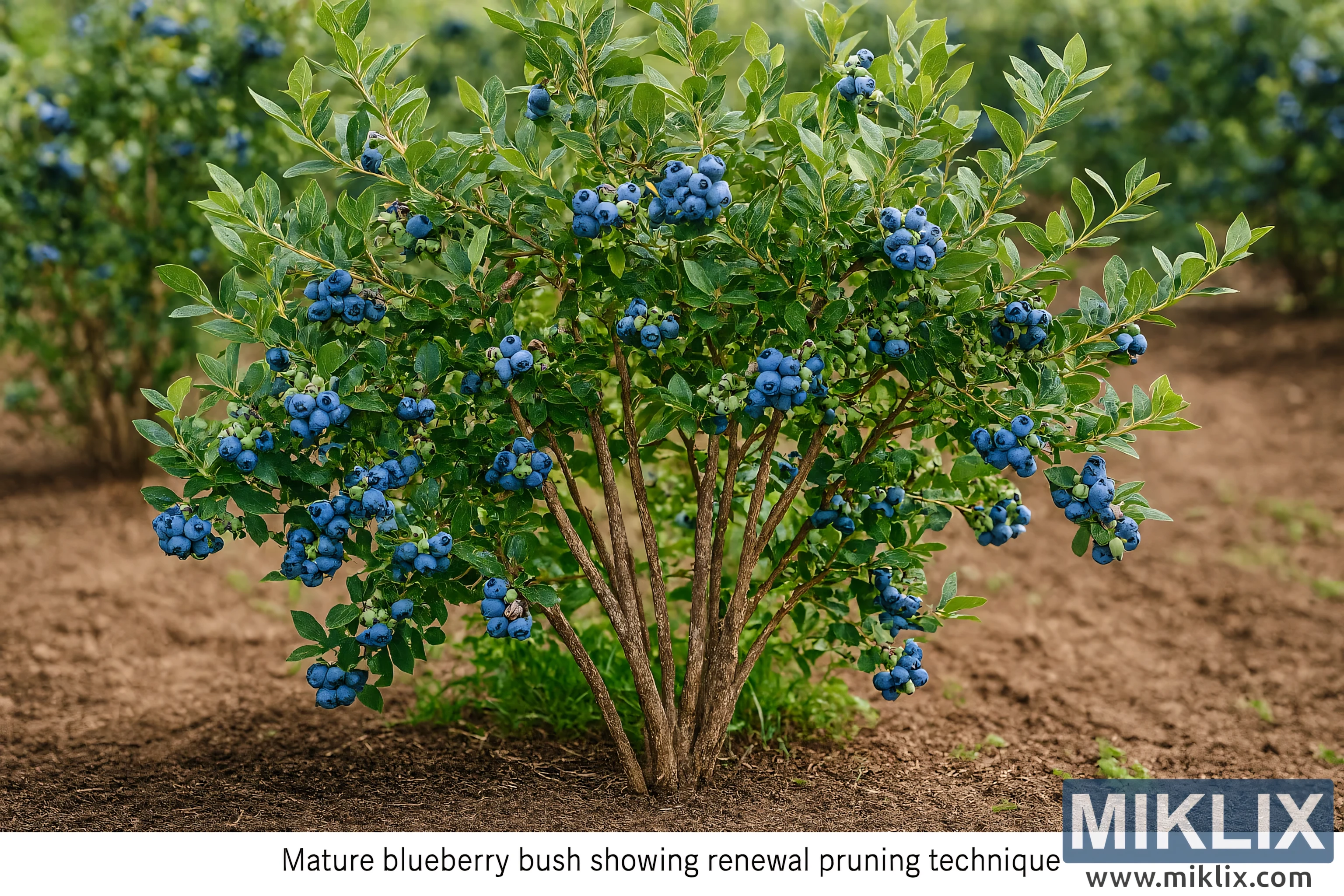Gambar resolusi dhuwur saka grumbulan blueberry diwasa sing nuduhake teknik pruning nganyari maneh, kanthi tebu sing sehat lan woh wohan beri sing mateng ing setelan kebon.