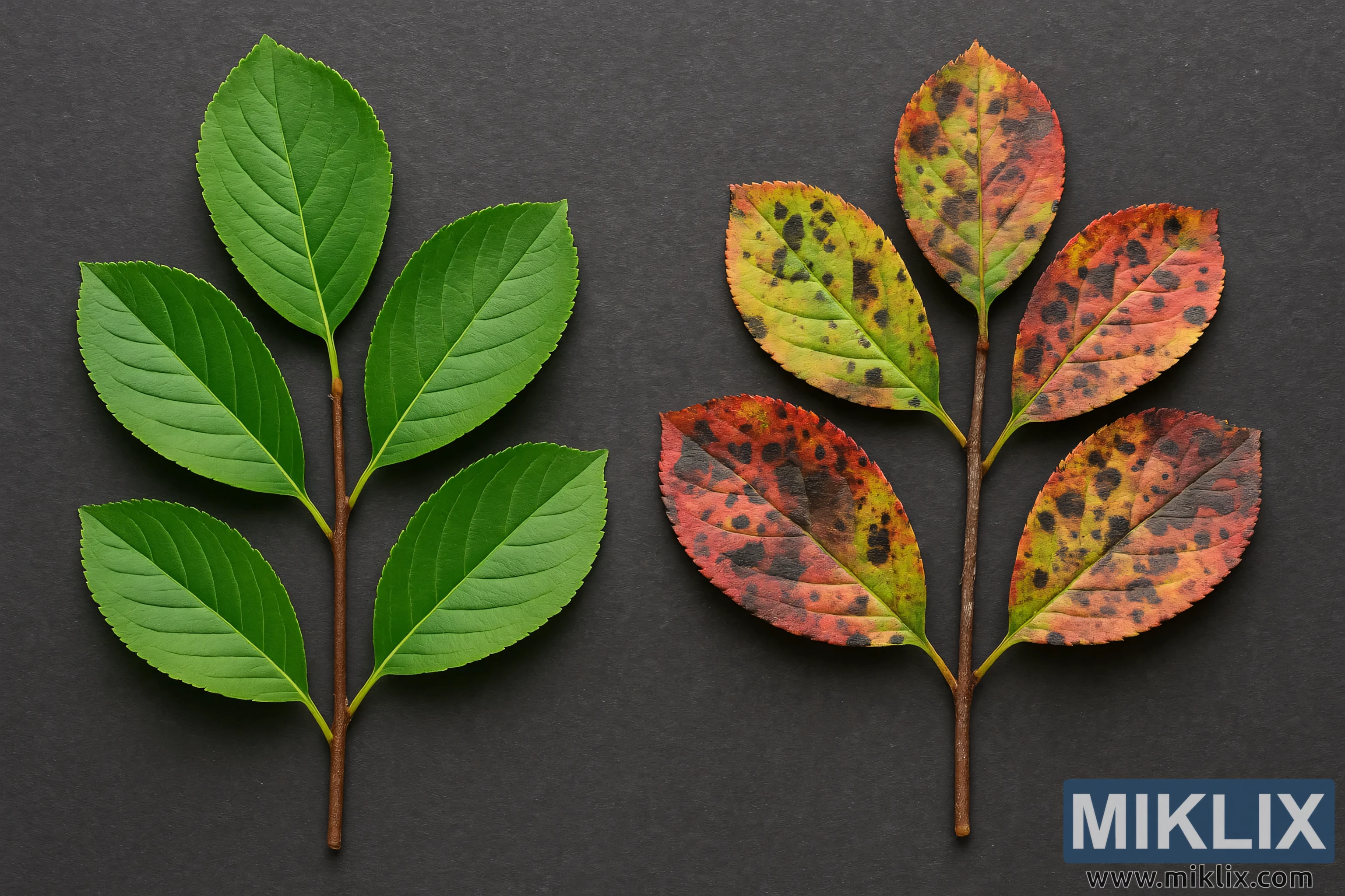 Foto botani resolusi dhuwur iki nampilake perbandingan sisih-by-side sing jelas saka godhong aronia (chokeberry) ing rong kahanan kesehatan sing kontras. Ing sisih kiwa, setangkai godhong aronia sing sehat nampilake warna ijo sing cerah, warna sing konsisten, lan venasi sing jelas. Saben godhong alus, turgid, lan simetris, kanthi pinggiran bergerigi sacoro apik sing nggambarake cahya kanthi rata. Midrib lan vena sekunder digambar kanthi cetha, menehi kontribusi kanggo rasa vitalitas lan integritas struktural khas tanduran sing sehat. Tekstur godhong nyaranake hidrasi lan keseimbangan nutrisi sing optimal, bebas saka cacat sing katon utawa stres lingkungan.